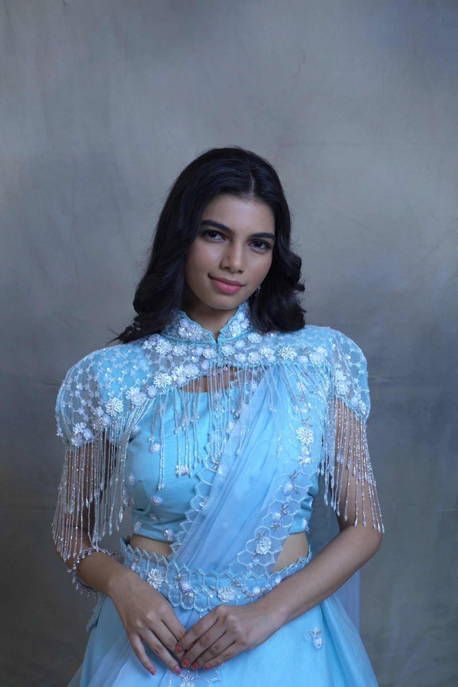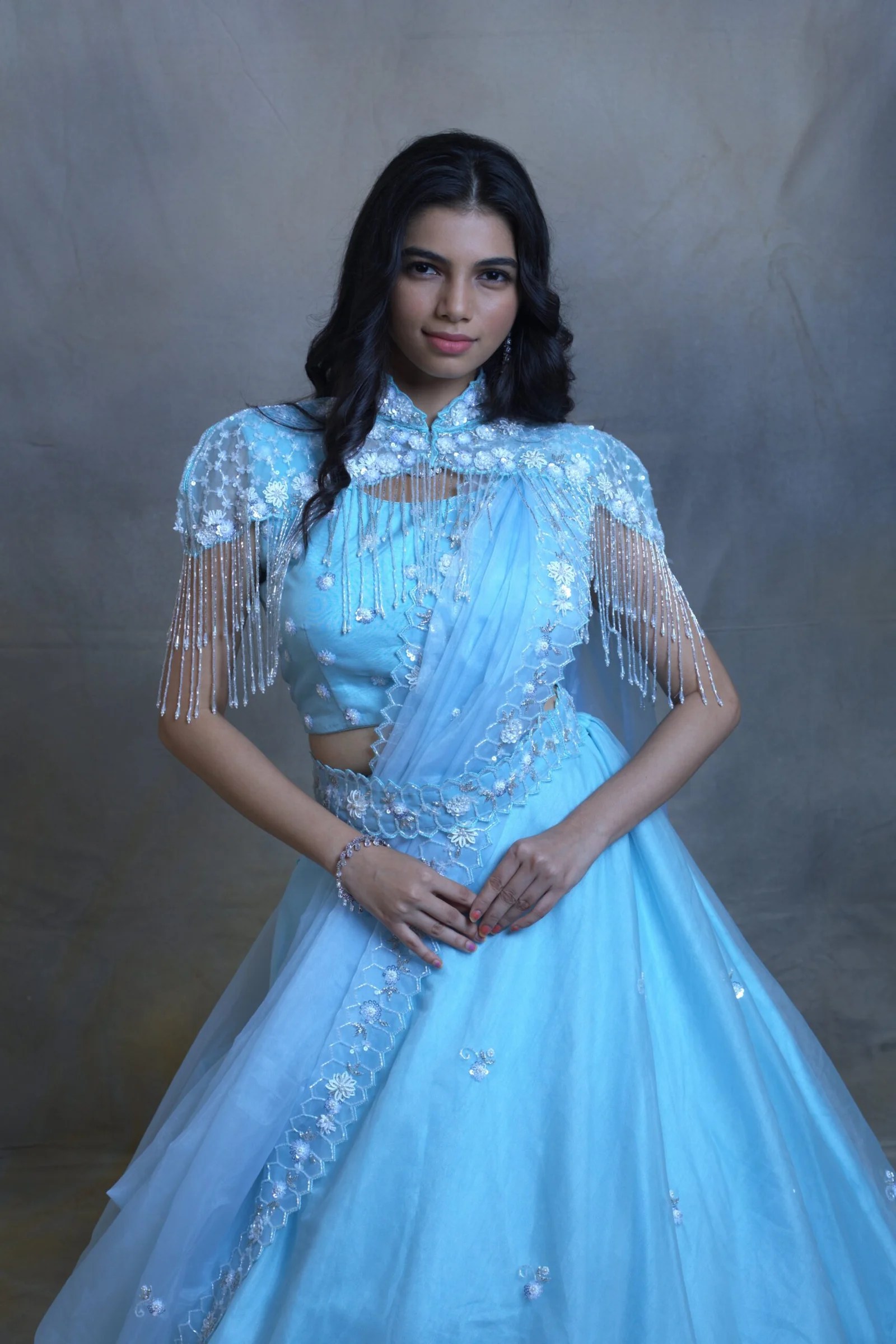 Turn heads at your next carnival or festive celebration with this ethereal Sky blue lehenga , paired with a stylish short cape. The cape features elegant long tassels and intricate kardana work, adding a touch of sparkle and movement to your look.