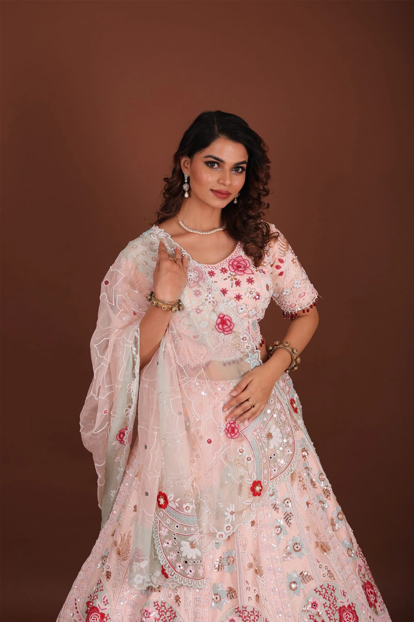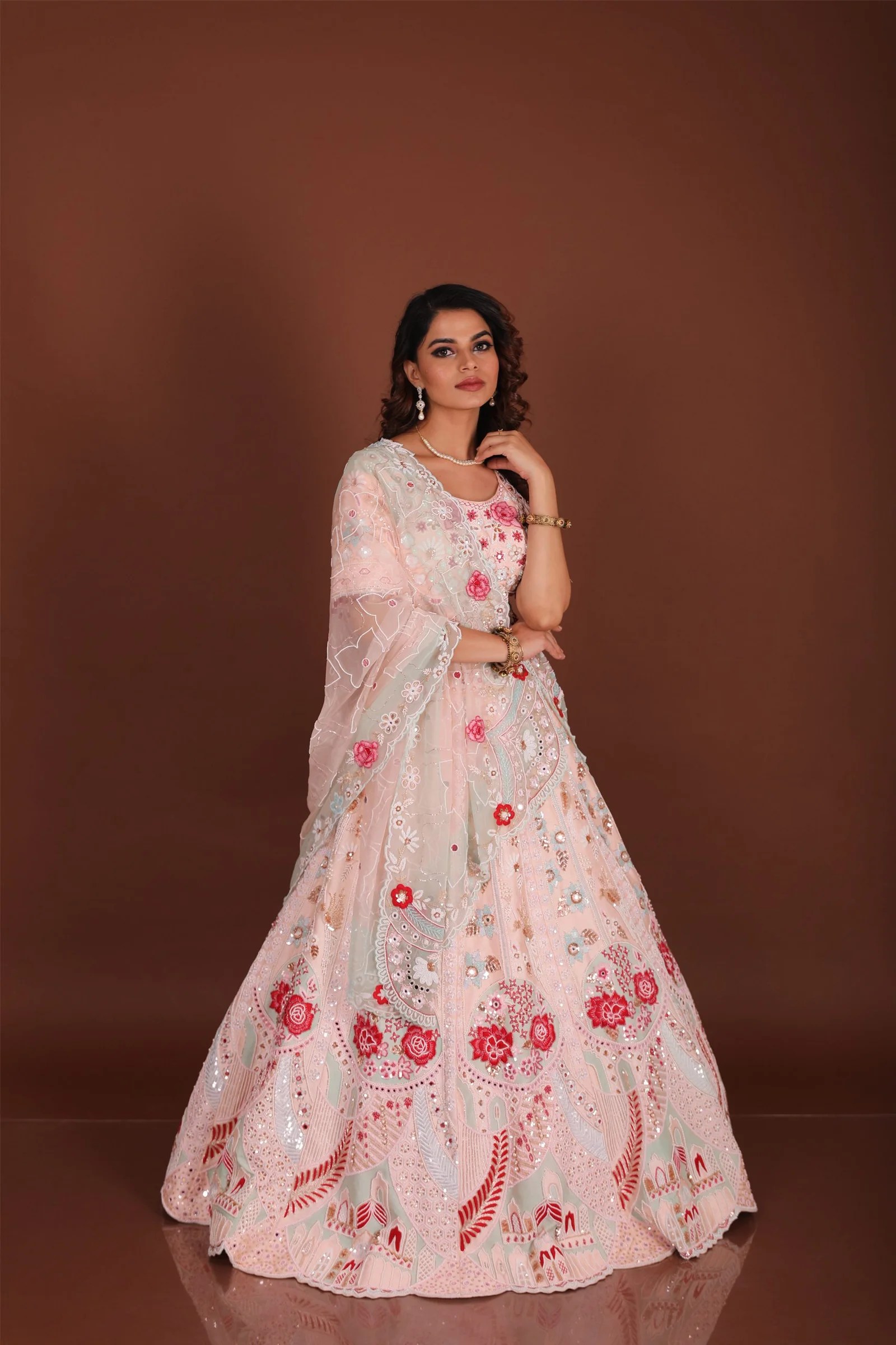 Step into timeless elegance with this exquisite pastel-shaded chaniya choli, crafted from premium silk fabric and adorned with intricate handcrafted thread embroidery. The ensemble is elevated with luxurious embellishments including pearls, mirrors, sequins, and delicate zardosi work, creating a perfect harmony of grace and grandeur.