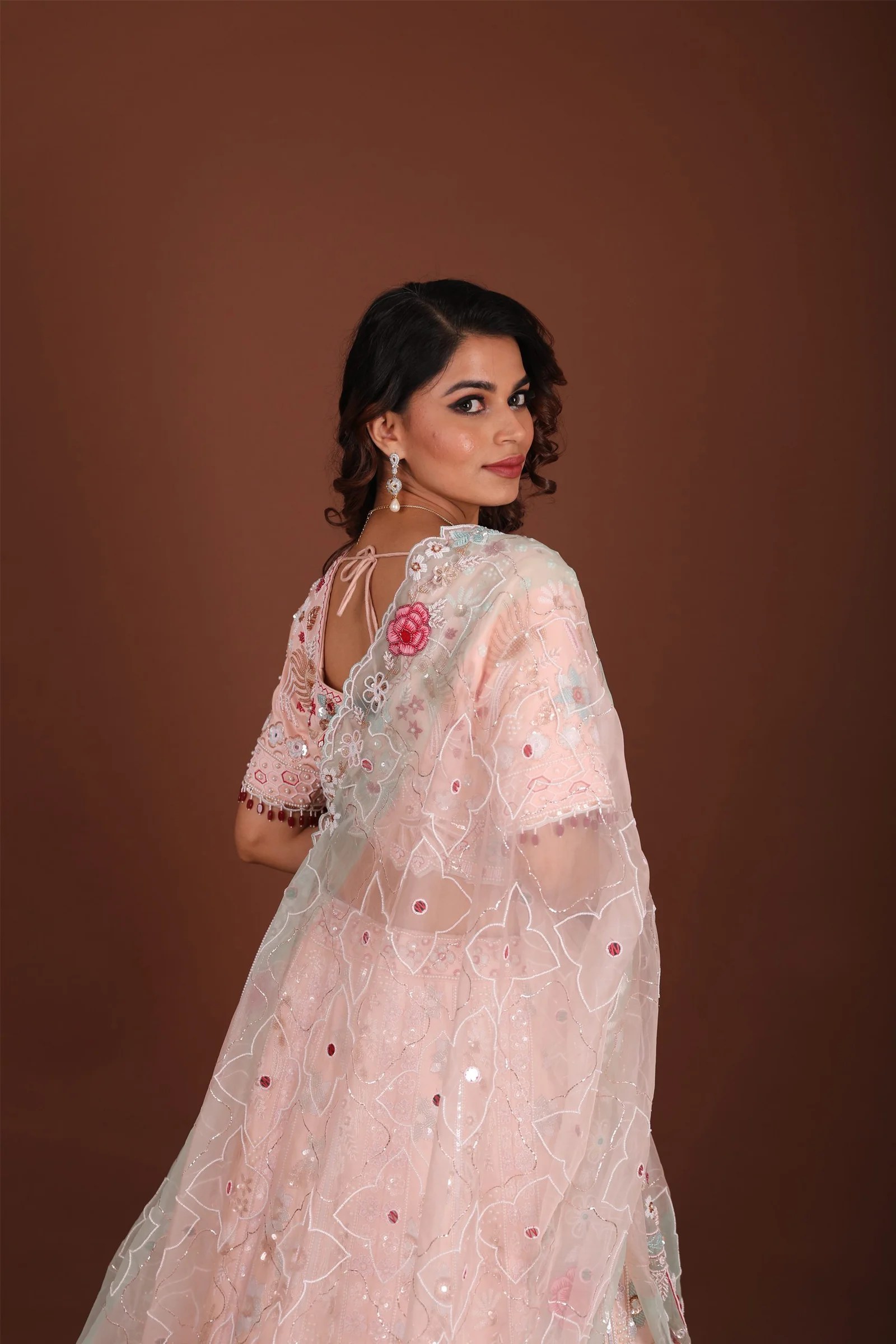 The soft pastel tones add a touch of serenity, while the detailed artisan work brings in a regal charm—making it an ideal choice for weddings, festive occasions, or statement ethnic wear.
