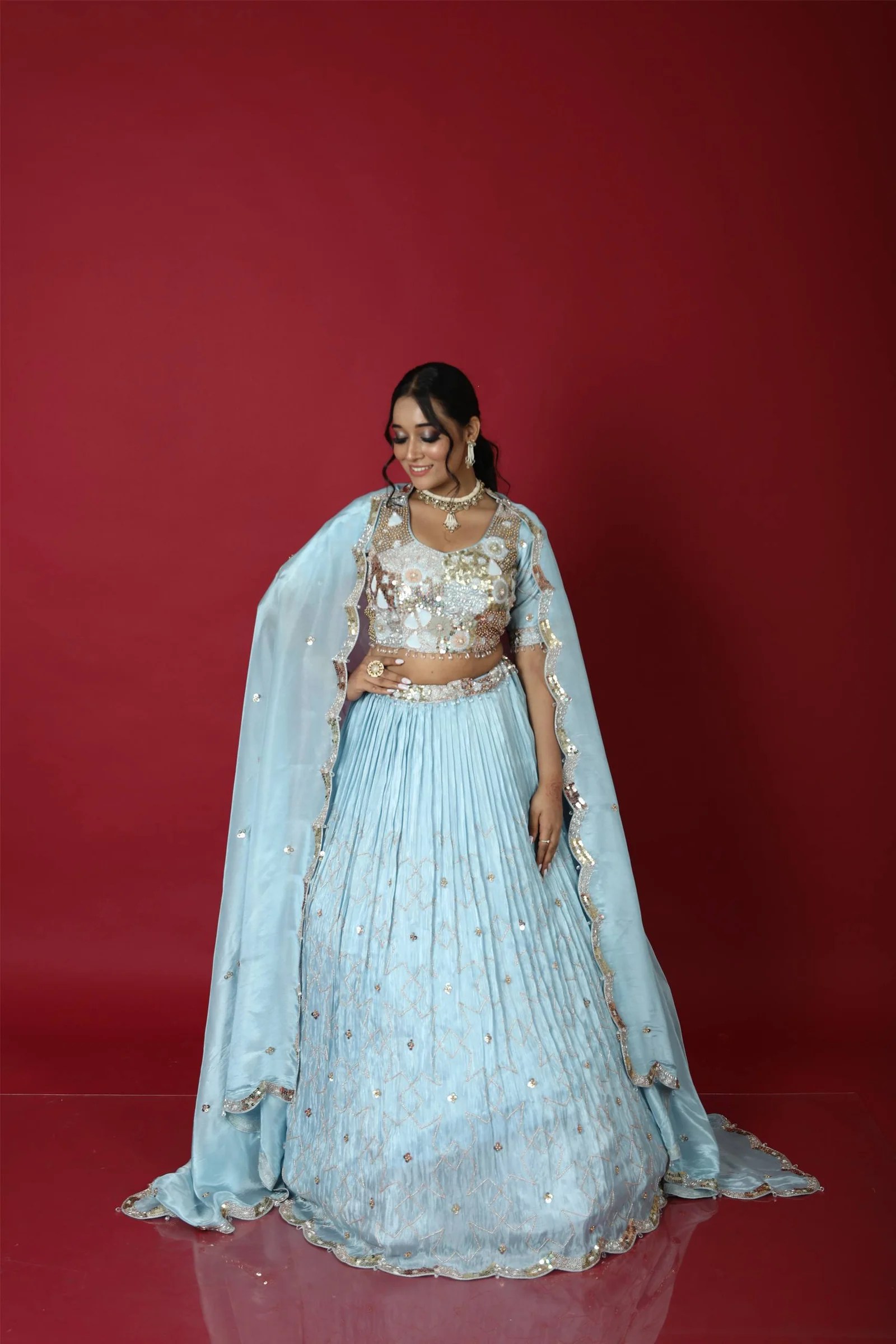 Step into elegance with this powder blue lehenga choli set, beautifully detailed with metallic sequin work. The flowing lehenga and matching blouse shimmer with intricate embellishments, while the lightweight dupatta adds a graceful touch with subtle sequin accents. Perfect for weddings and festive occasions, this ensemble blends soft charm with a hint of sparkle.