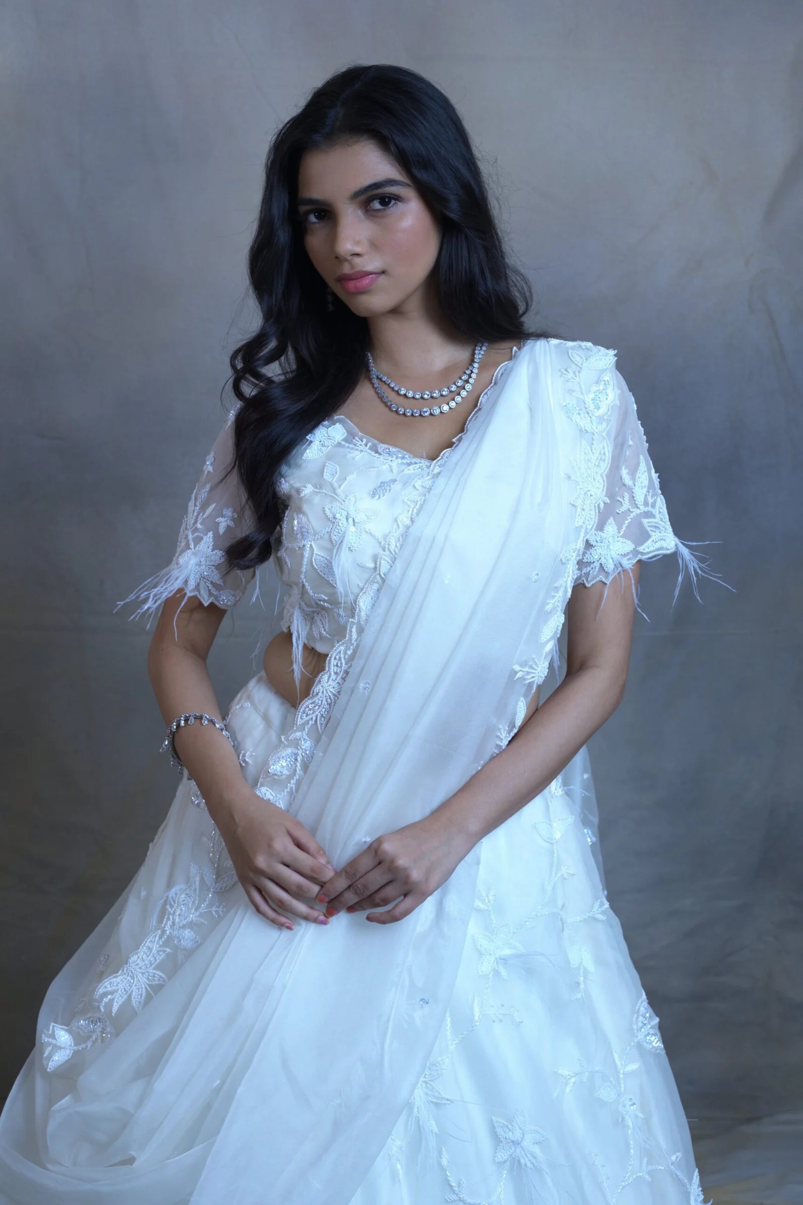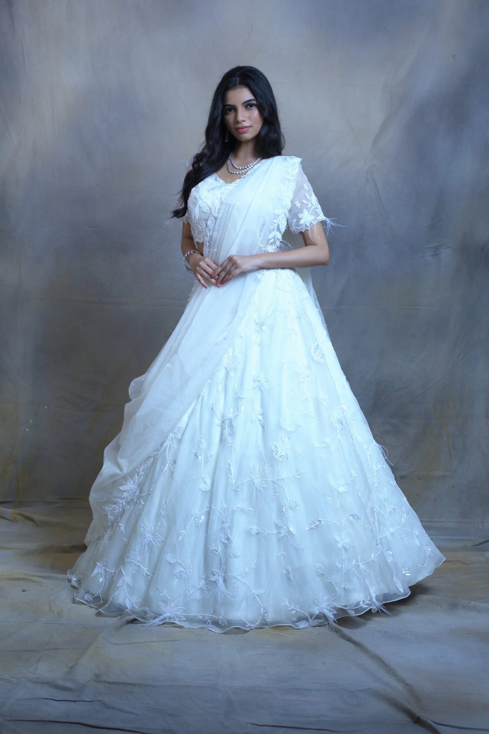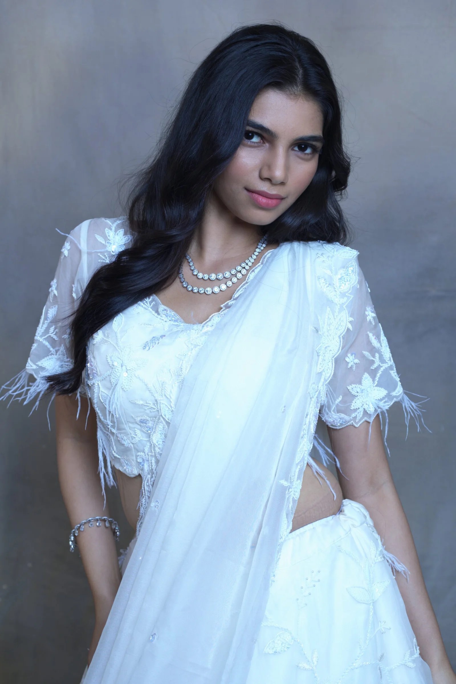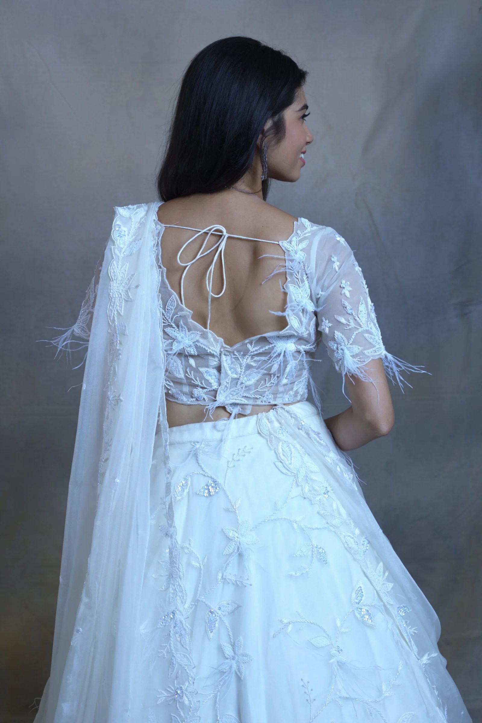 Grace meets craftsmanship in this ethereal pure white lehenga, beautifully handwoven with intricate self kardana work that adds a subtle shimmer and refined texture. Delicate floral motifs blossom across the ensemble, while soft feather accents lend a dreamy, couture-inspired touch.