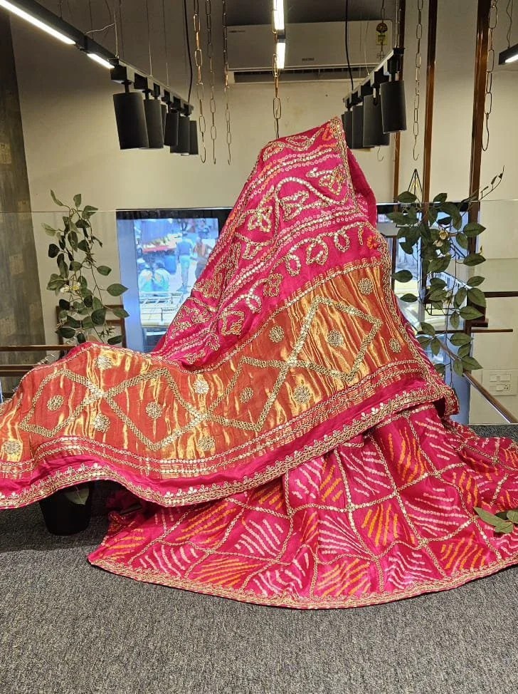Elegance meets tradition in this stunning pure Gajji silk Bandhej saree, handcrafted with intricate Rai Bandhani designs and adorned with luxurious gotta work. The rich texture of Gajji silk, paired with vibrant Bandhej patterns, makes it a perfect choice for weddings and traditional occasions. A timeless piece that blends heritage with sophistication.