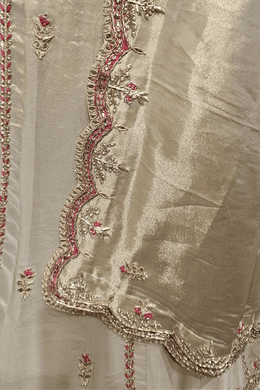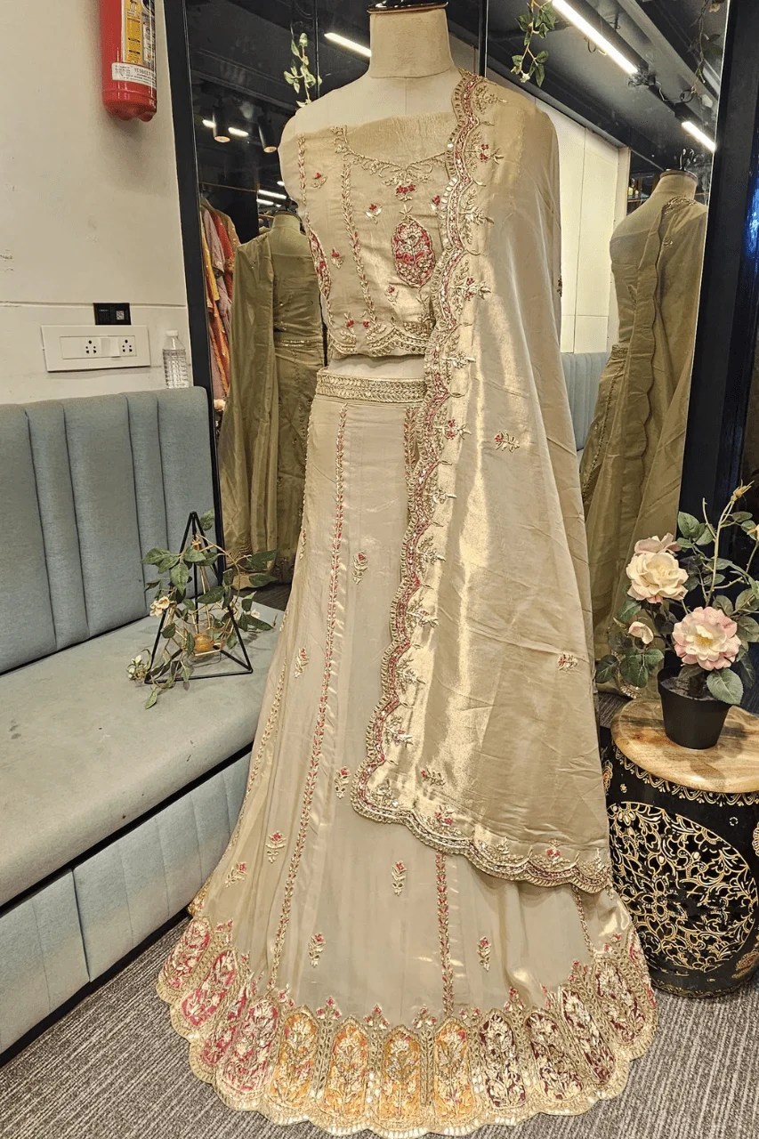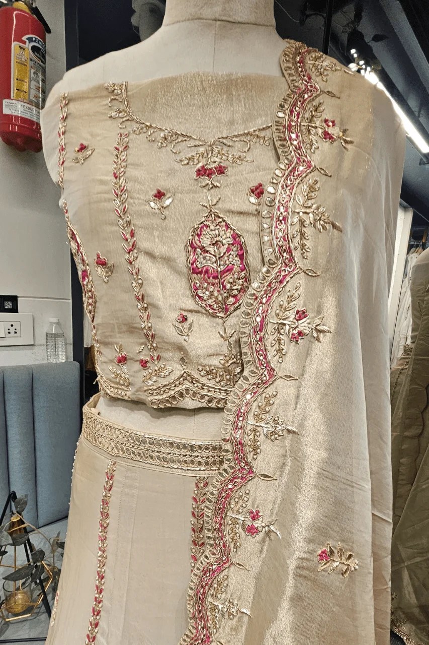 Perfect for weddings and festive celebrations, this elegant lehenga with applique detailing in rich pearl tissue is adorned with traditional gotta,zardoshi and pearl handwork. Paired with an unstitched blouse and a beautifully scalloped dupatta border, it exudes timeless Rajasthani charm with a touch of modern grace.