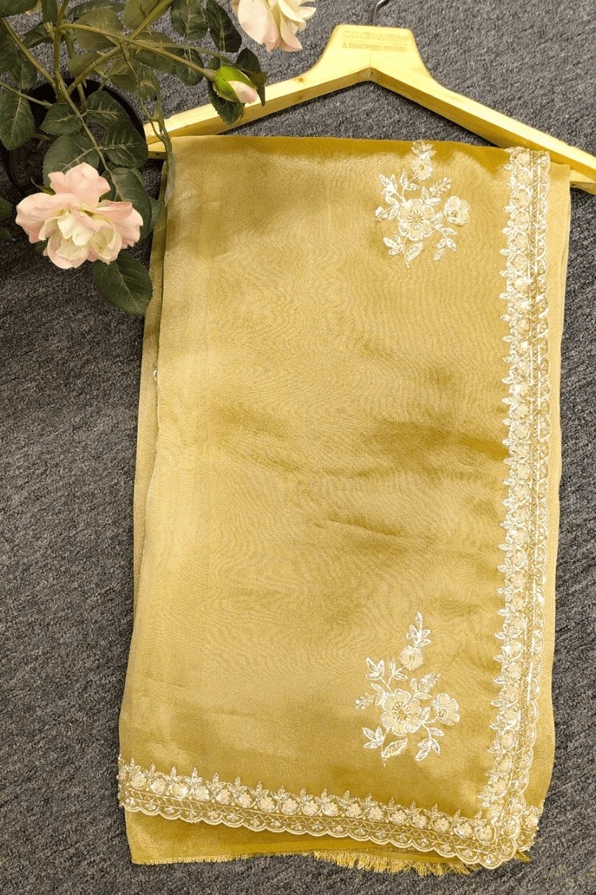 A delicate tissue organza saree featuring a delicate zari border, adorned with intricate booties all over, beautifully embellished with zardoshi,sequence and pearl work for a touch of timeless elegance and regal charm.