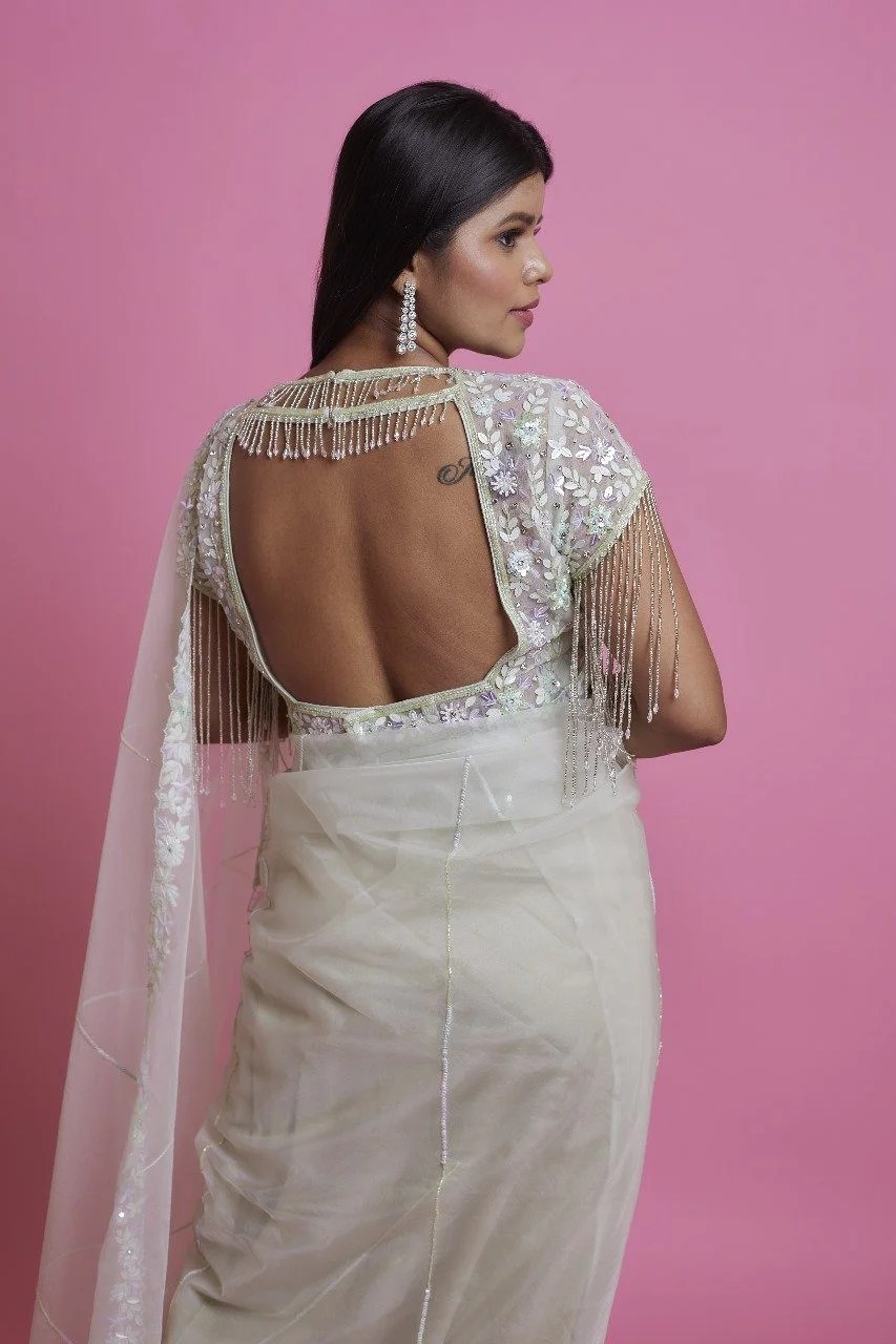 A divine white organza saree featuring delicate white and self-sequins work that adds a subtle, ethereal shimmer. Finished with soft tassels for an elegant touch, this saree embodies grace and purity—perfect for weddings, engagements, or serene celebrations.