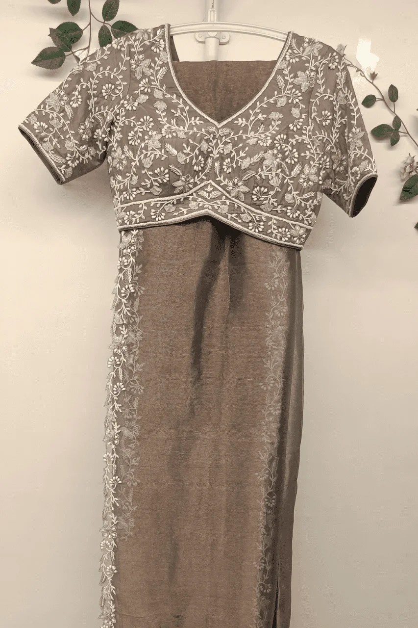 Elegantly crafted in sheer tissue, this saree features exquisite cutdana and pearl work. The sophisticated metallic bronze hue adds a touch of modern grace to its traditional craftsmanship.”
