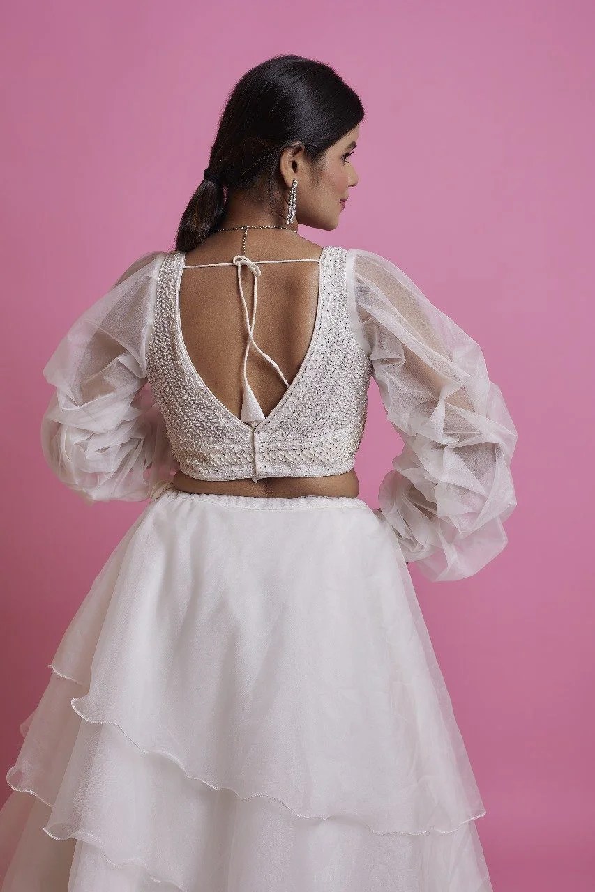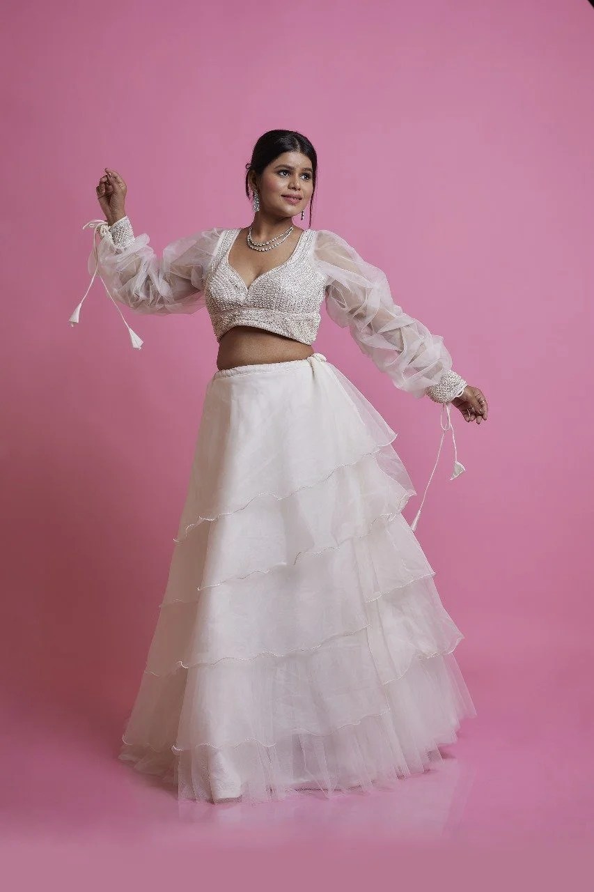 Step into the spotlight with this ethereal white lehenga, adorned with self sequin embellishments that shimmer with every move. Crafted from airy organza fabric, the ensemble strikes a perfect balance between grace and glamour. The blouse features dramatic long balloon sleeves, adding a contemporary twist with ruffled dupatta and elevating the overall look with a touch of flair.