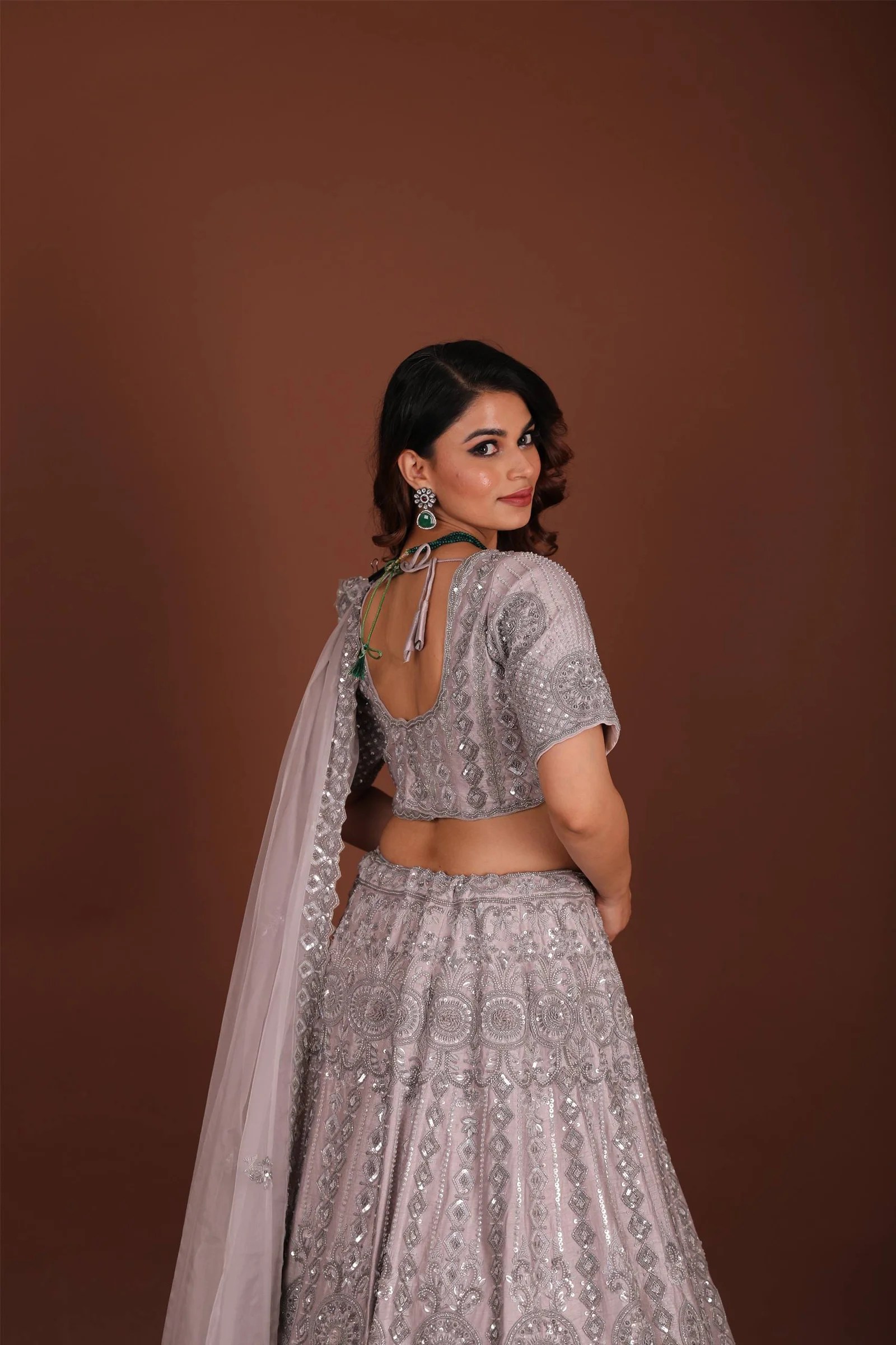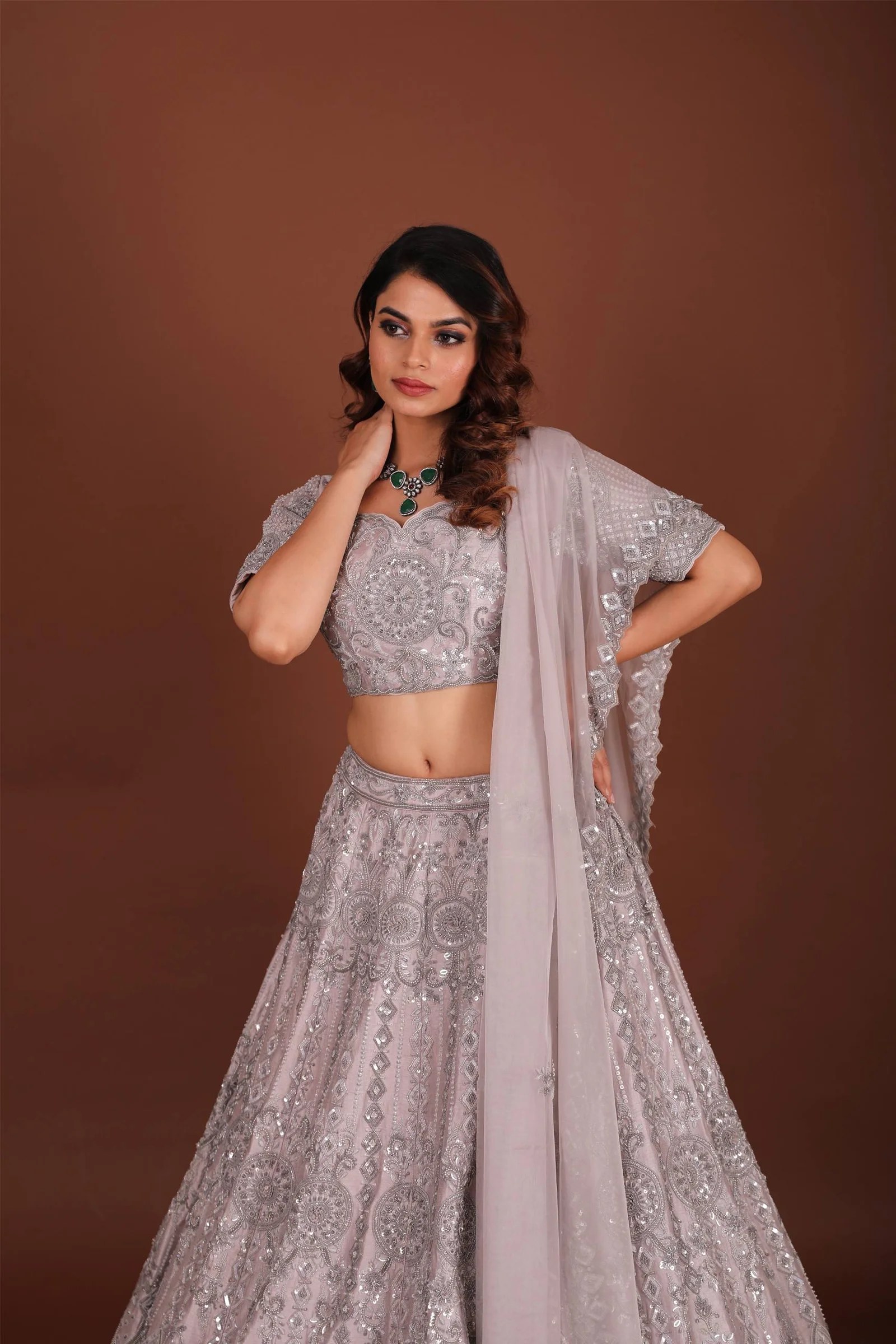 Grace meets grandeur in this stunning grey chaniya choli, beautifully crafted on luxurious silk fabric. The ensemble showcases intricate handcrafted cutdana and sequins work, lending a refined sparkle and timeless elegance to the traditional silhouette. The soft, flowing chaniya (skirt) pairs harmoniously with a richly embellished choli (blouse), creating a regal look ideal for weddings, festive celebrations, or evening soirées.