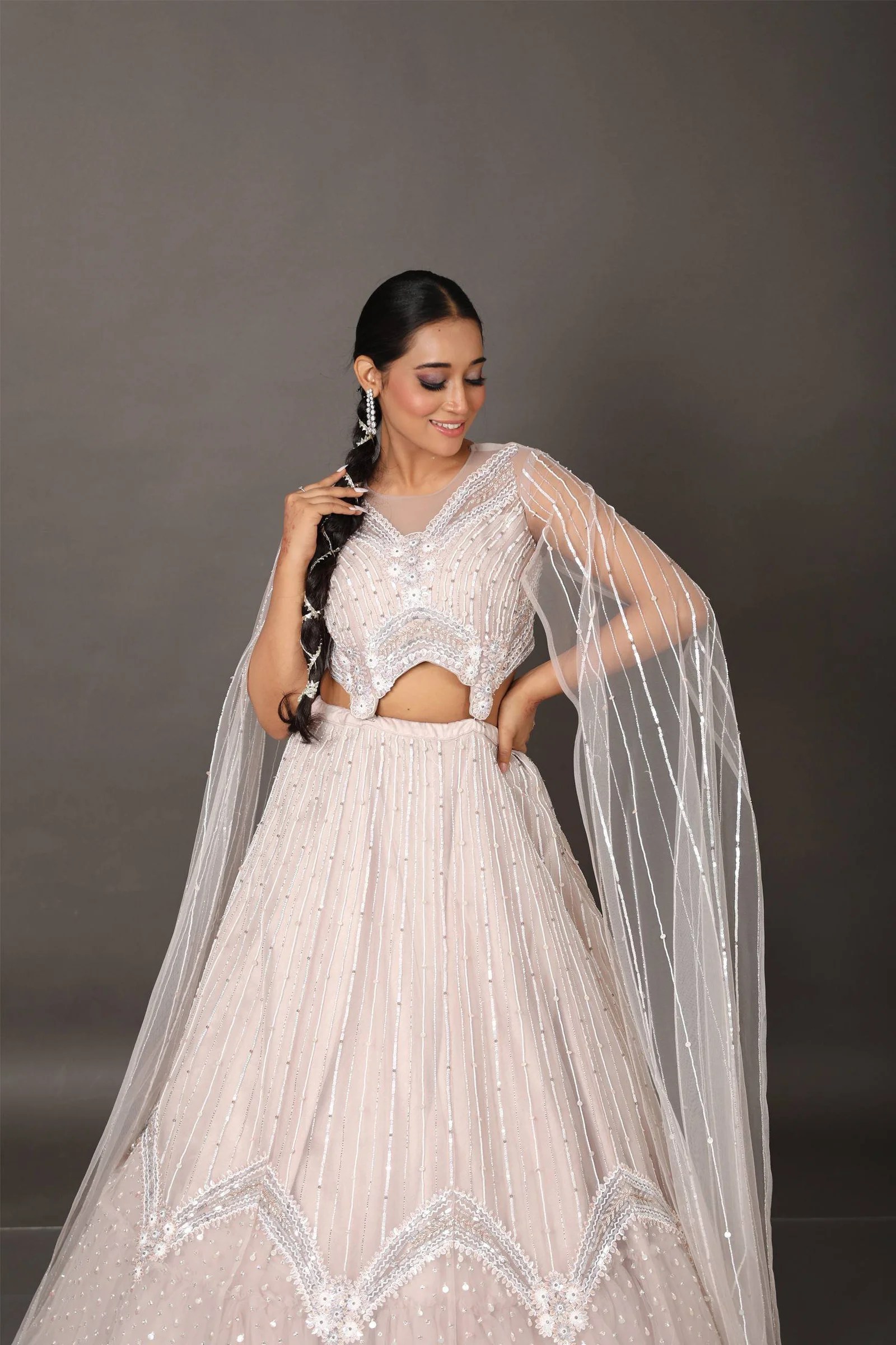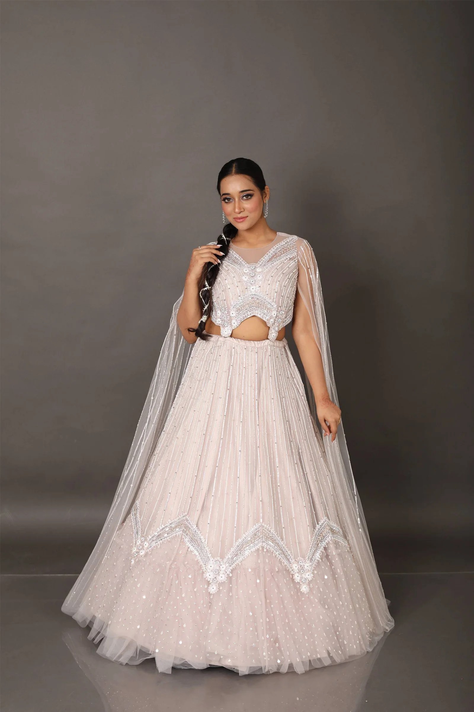 Turn heads in this ethereal net fabric lehenga, exquisitely handcrafted to exude timeless elegance. The ensemble features delicate sequin and cutdana embroidery, adding just the right amount of shimmer and sophistication. A standout element is the long tail sleeves, gracefully designed to elevate the silhouette with a regal flair. Whether it’s a wedding celebration or a festive soirée, this lehenga promises a look that’s both graceful and unforgettable.