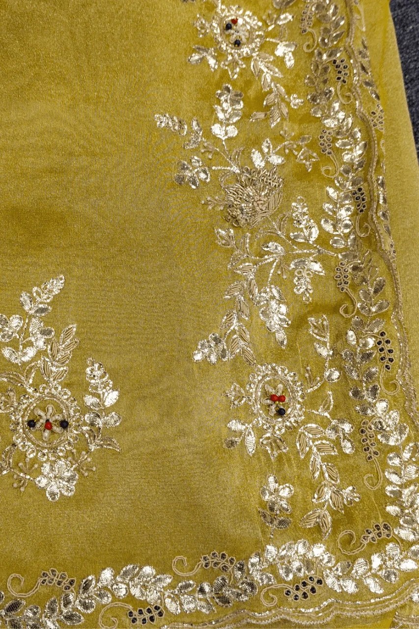 A stunning tissue organza saree in a regal bright yellow hue, adorned with rich gotta work, shimmering sequence, and delicate pitha work. Traditional craftsmanship meets timeless elegance—perfect for festive and wedding occasions.