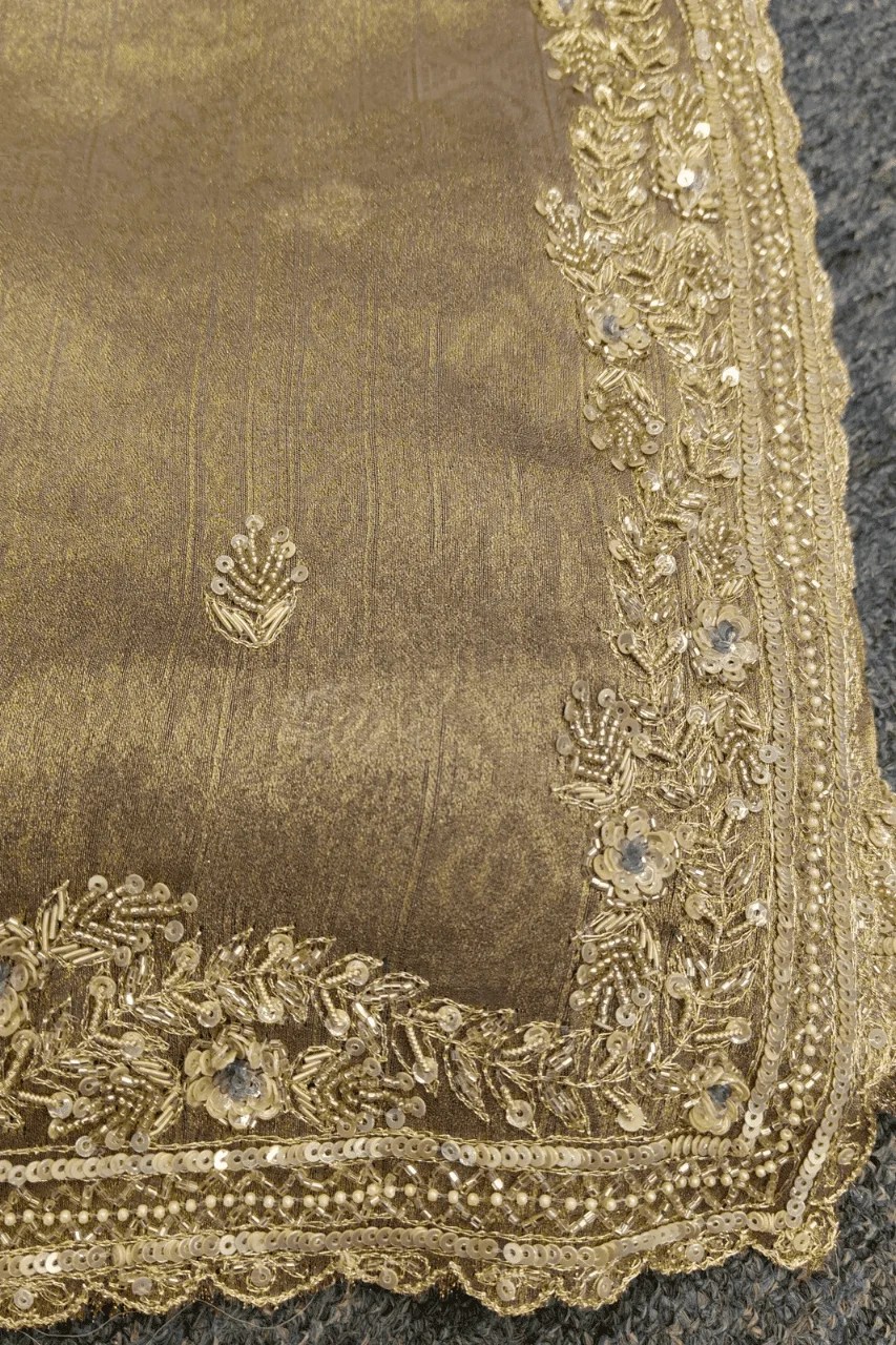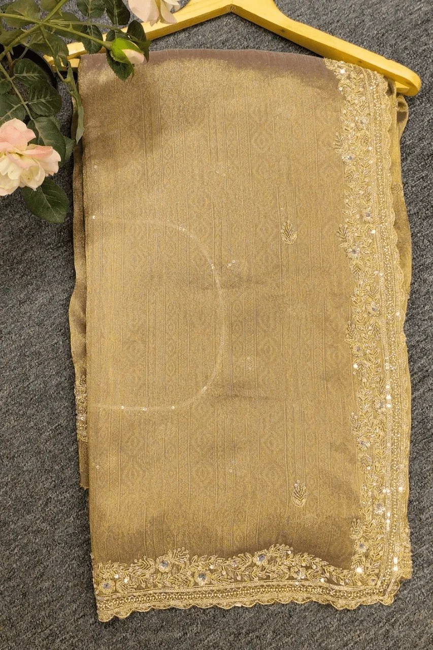 A delicate tissue organza saree featuring a delicate zari border, adorned with intricate booties all over, beautifully embellished with zardoshi and sequence work for a touch of timeless elegance and regal charm.