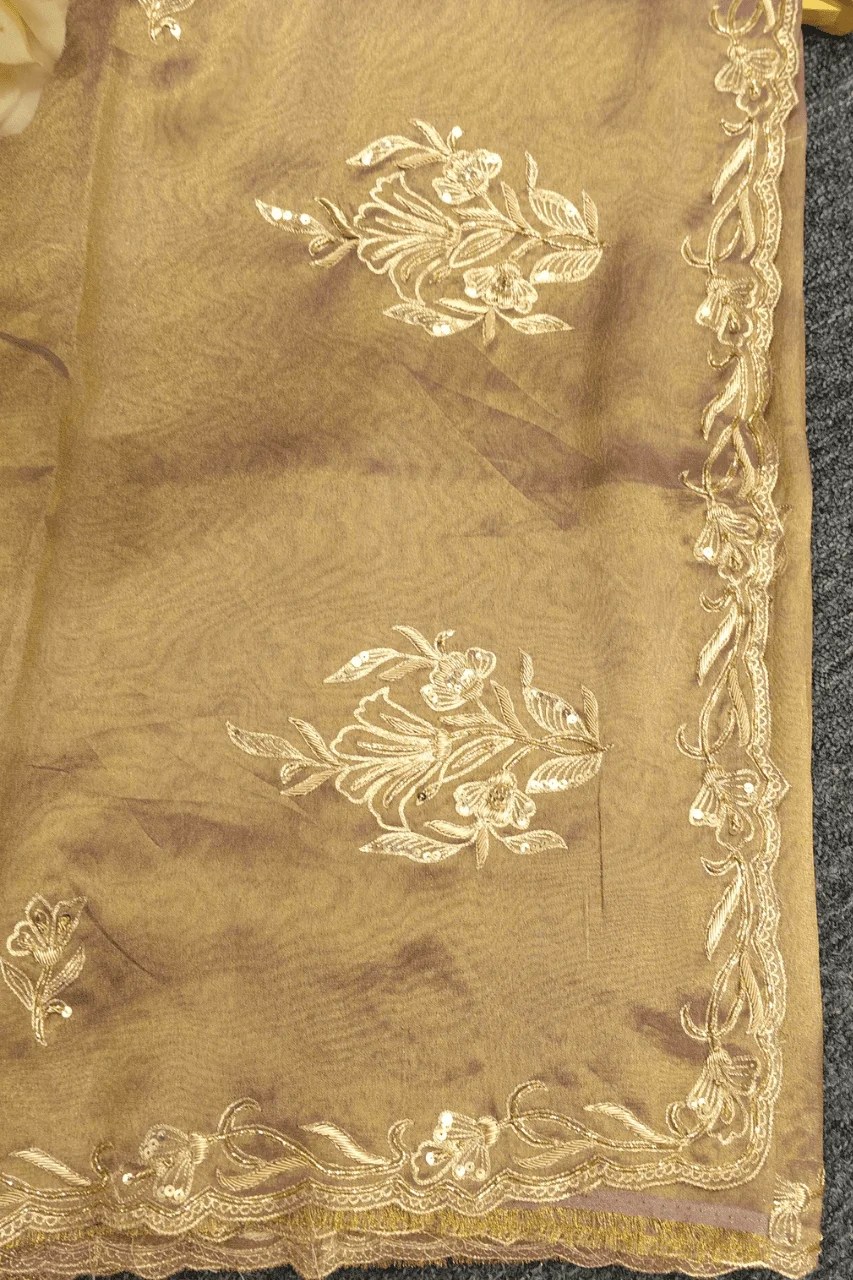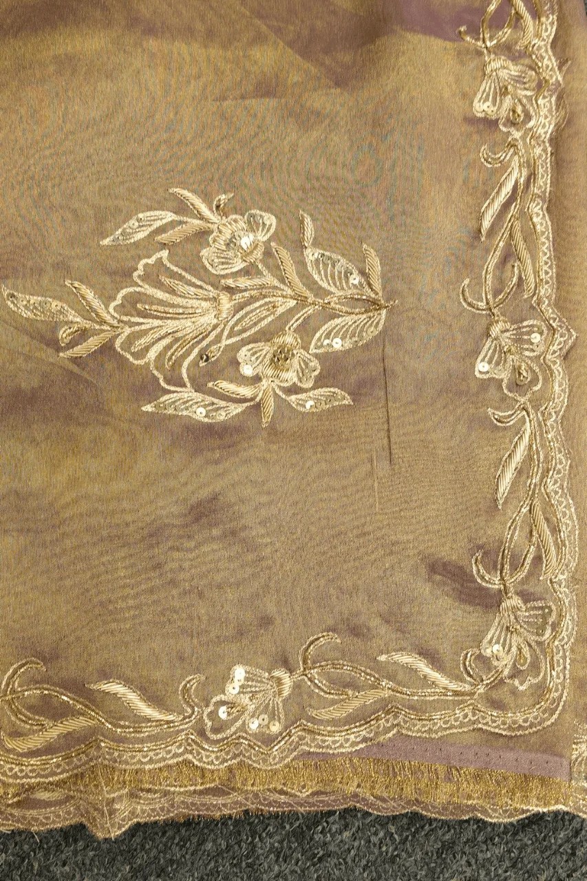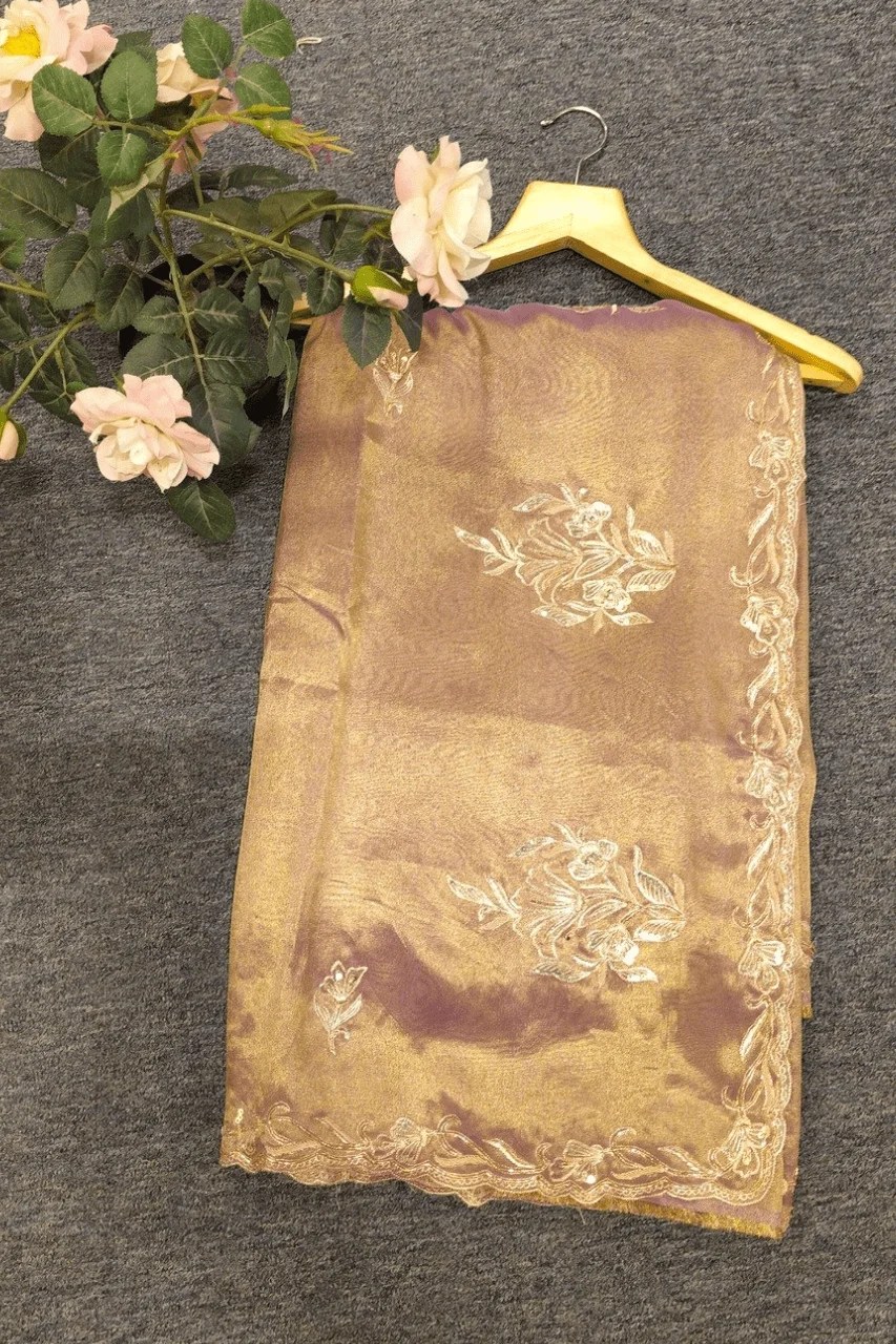 A delicate tissue organza saree featuring a delicate zari border, adorned with intricate booties all over, beautifully embellished with zardozi and nakshi work for a touch of timeless elegance and regal charm.