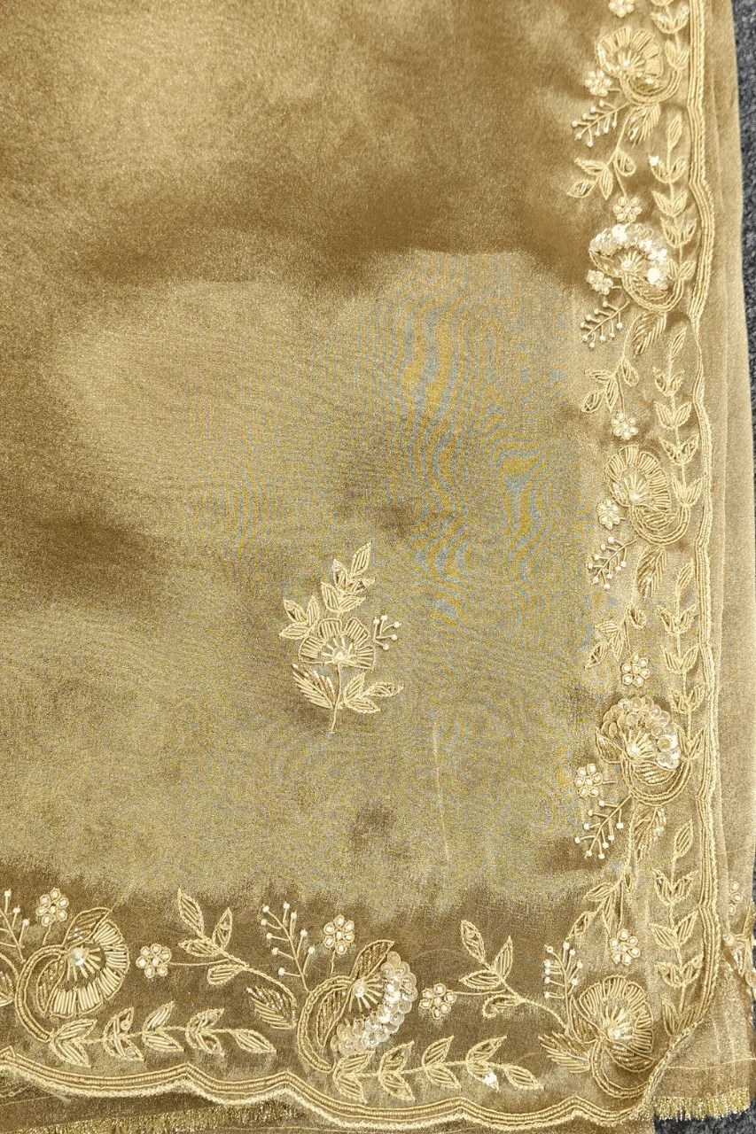 A delicate tissue organza saree featuring a delicate zari border, adorned with intricate booties all over, beautifully embellished with zardozi and nakshi work for a touch of timeless elegance and regal charm.