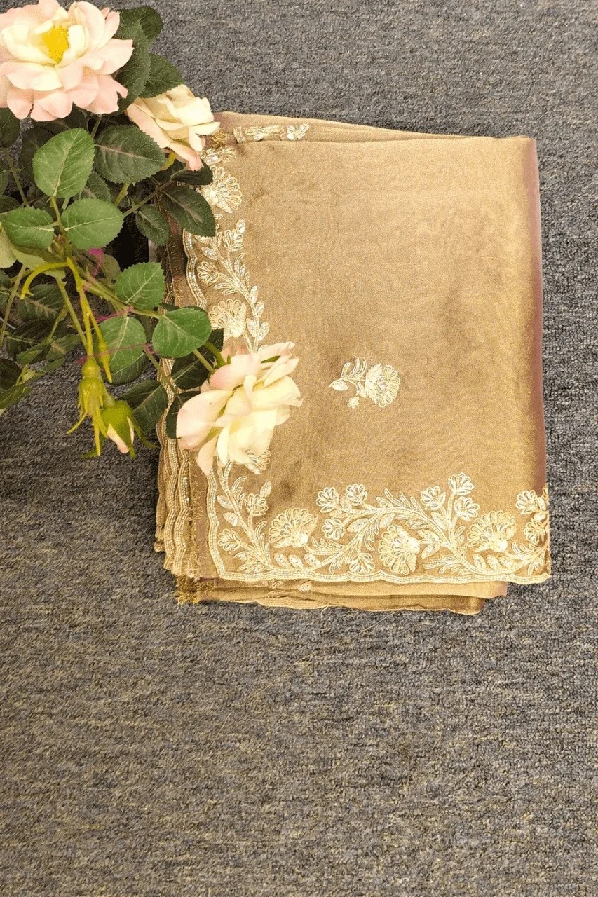 A delicate tissue organza saree featuring a delicate zari border, adorned with intricate booties all over, beautifully embellished with zardoshi, sequence and cutdana work for a touch of timeless elegance and regal charm.