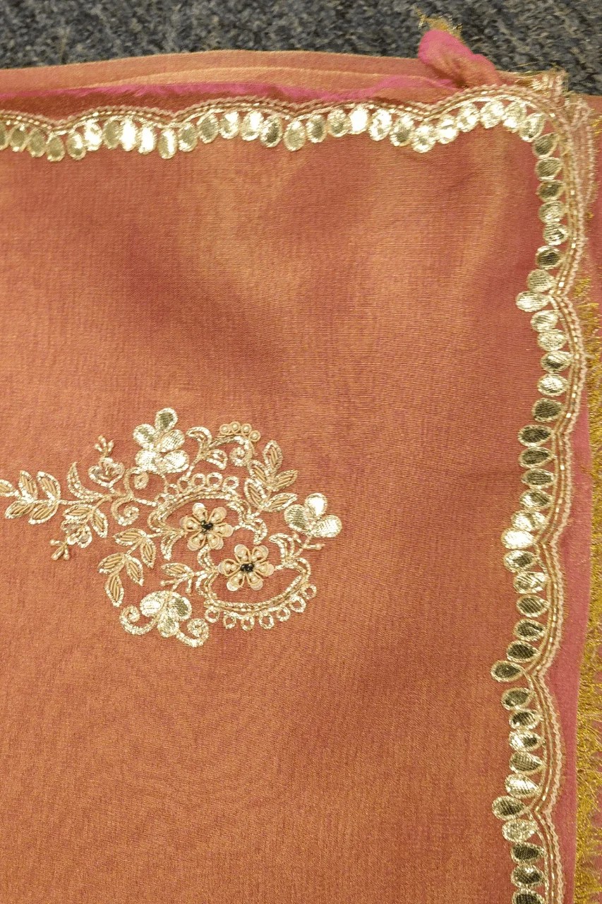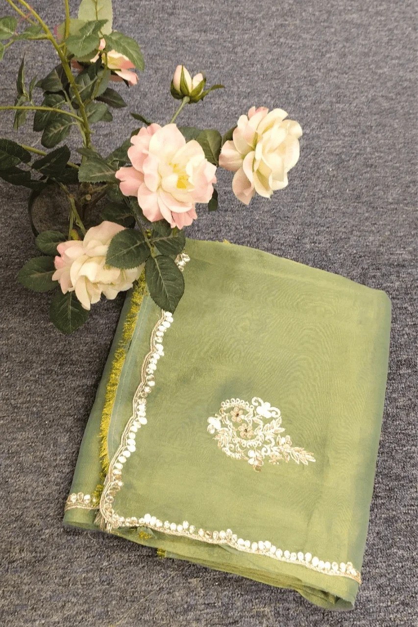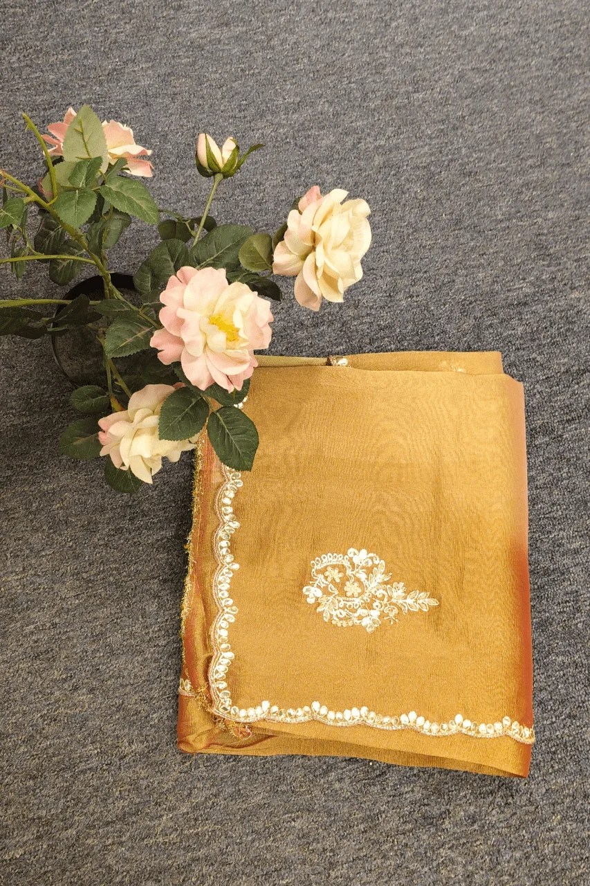 A delicate tissue organza saree featuring a light gotta border, adorned with intricate booties all over, beautifully embellished with zardozi and nakshi work for a touch of timeless elegance and regal charm.