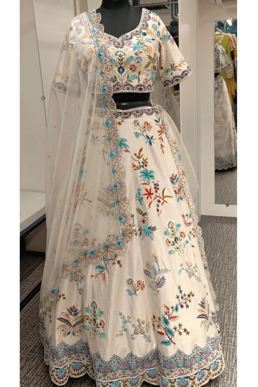 Make a grand statement on your special day with this stunning White Multicolored Lehenga, a masterpiece of traditional craftsmanship and regal elegance. Meticulously designed for weddings and unforgettable occasions, this lehenga features heavy silk thread embroidery with pearl and colourful sequence embellishments, showcasing intricate handwork that exudes timeless luxury and opulence.