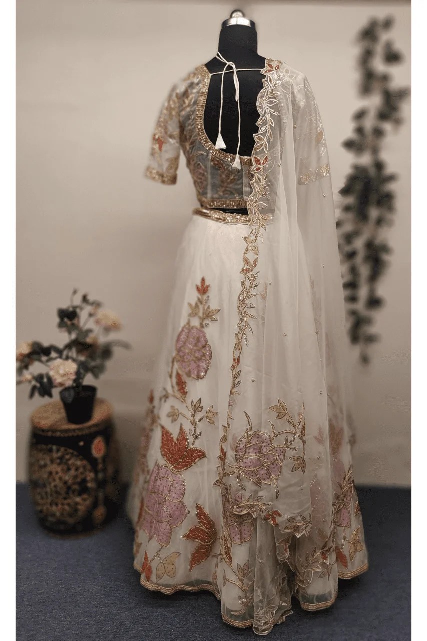 Embrace timeless grace with this pristine white lehenga, crafted from soft, flowing organza that exudes lightness and charm. Adorned with delicate floral appliqué motifs, each bloom is carefully outlined with traditional gotta work—bringing a beautiful blend of heritage and artistry to the modern silhouette.Sequins are thoughtfully placed to highlight the floral patterns, adding just the right touch of sparkle that shimmers subtly with every step. The contrast of intricate detailing against the clean white canvas creates a look that is both dreamy and regal.