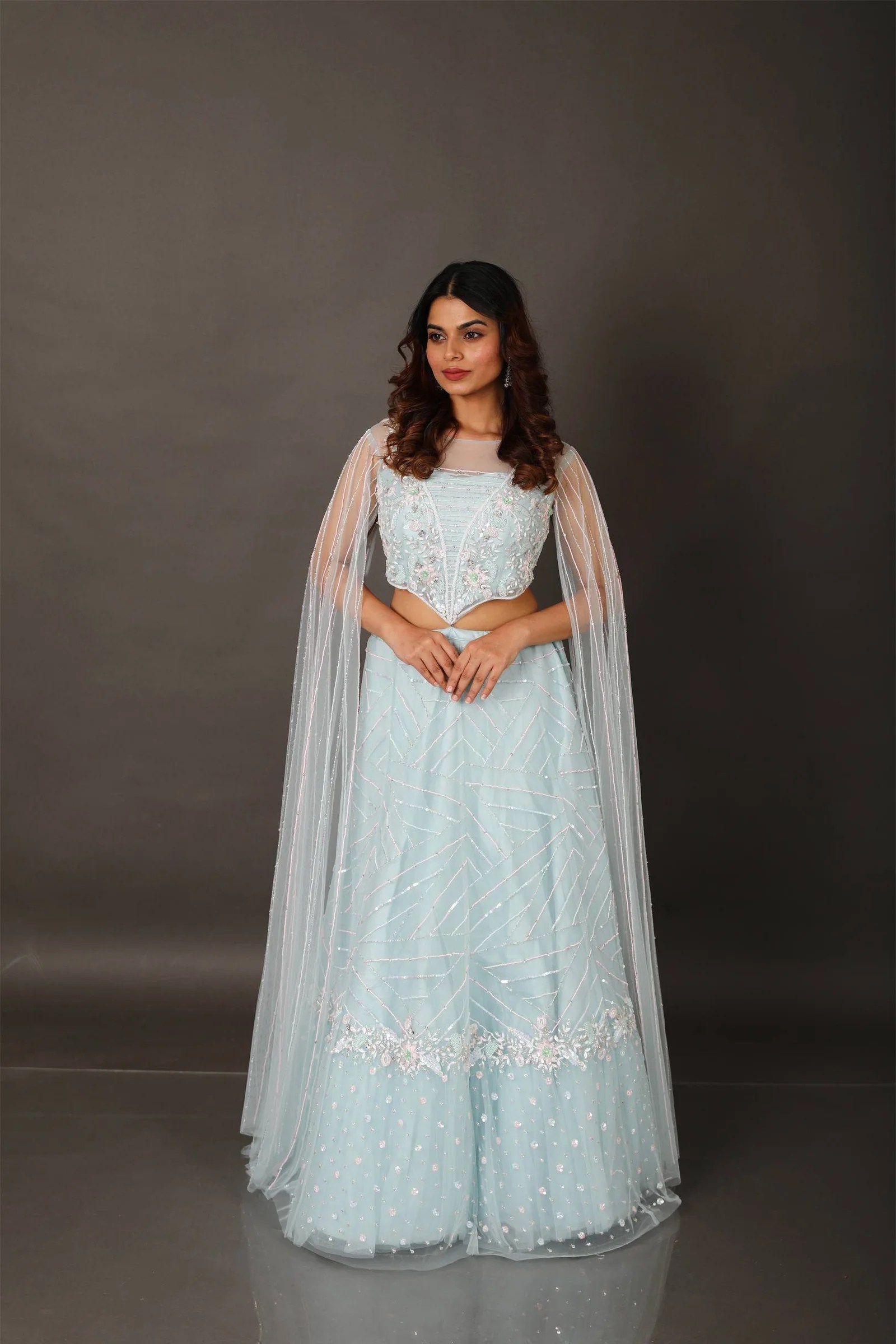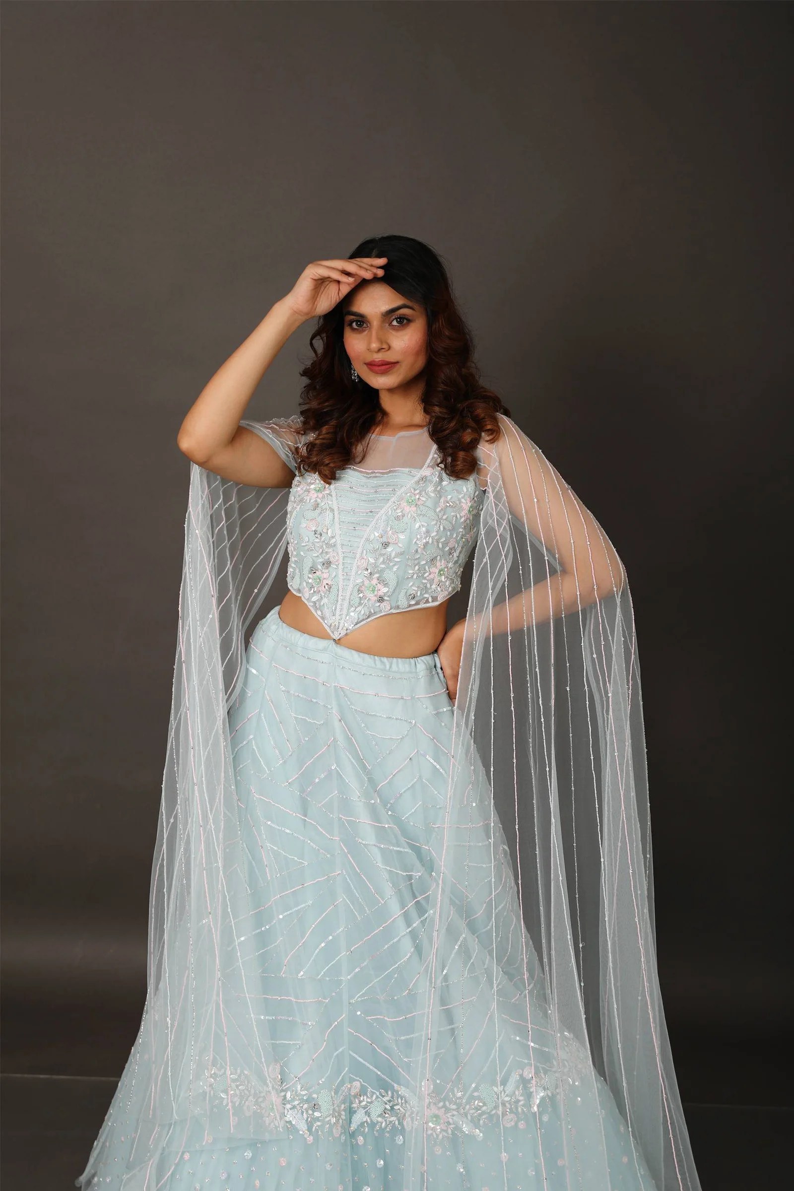 Turn heads in this ethereal net fabric lehenga, exquisitely handcrafted to exude timeless elegance. The ensemble features delicate sequin and cutdana embroidery, adding just the right amount of shimmer and sophistication. A standout element is the long cape sleeves, gracefully designed to elevate the silhouette with a regal flair. Whether it’s a wedding celebration or a festive soirée, this lehenga promises a look that’s both graceful and unforgettable.