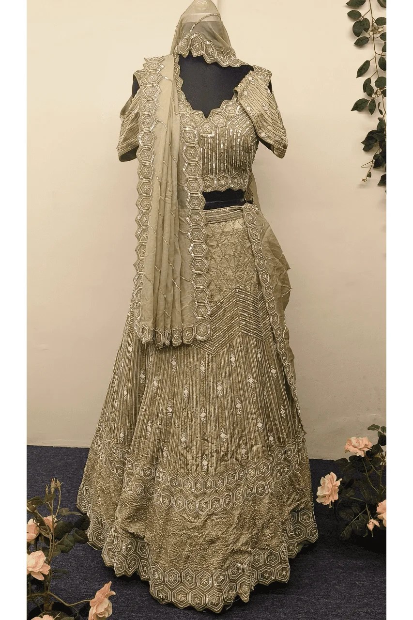 Elevate your mehendi look with this exquisite olive green lehenga, crafted from luxurious silk and paired with a sheer, flowy organza dupatta. A true celebration of artistry, this ensemble is adorned with handcrafted geometric patterns brought to life through intricate sequin, pearl, and thread work.