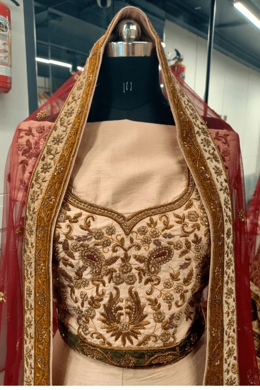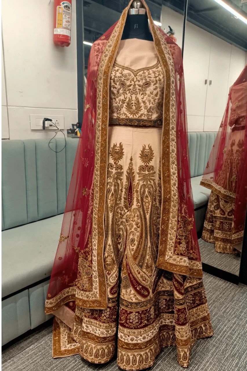 This exquisite traditional white silk lehenga is a true statement of timeless elegance. Richly adorned with intricate antique zardosi work on luxurious velvet appliqué, it reflects masterful craftsmanship and regal charm. The ensemble is completed with heavy border and a contrast net dupatta, delicately embellished to enhance its grandeur. Perfect for weddings and grand celebrations, this lehenga exudes grace, tradition, and sophistication in every detail.