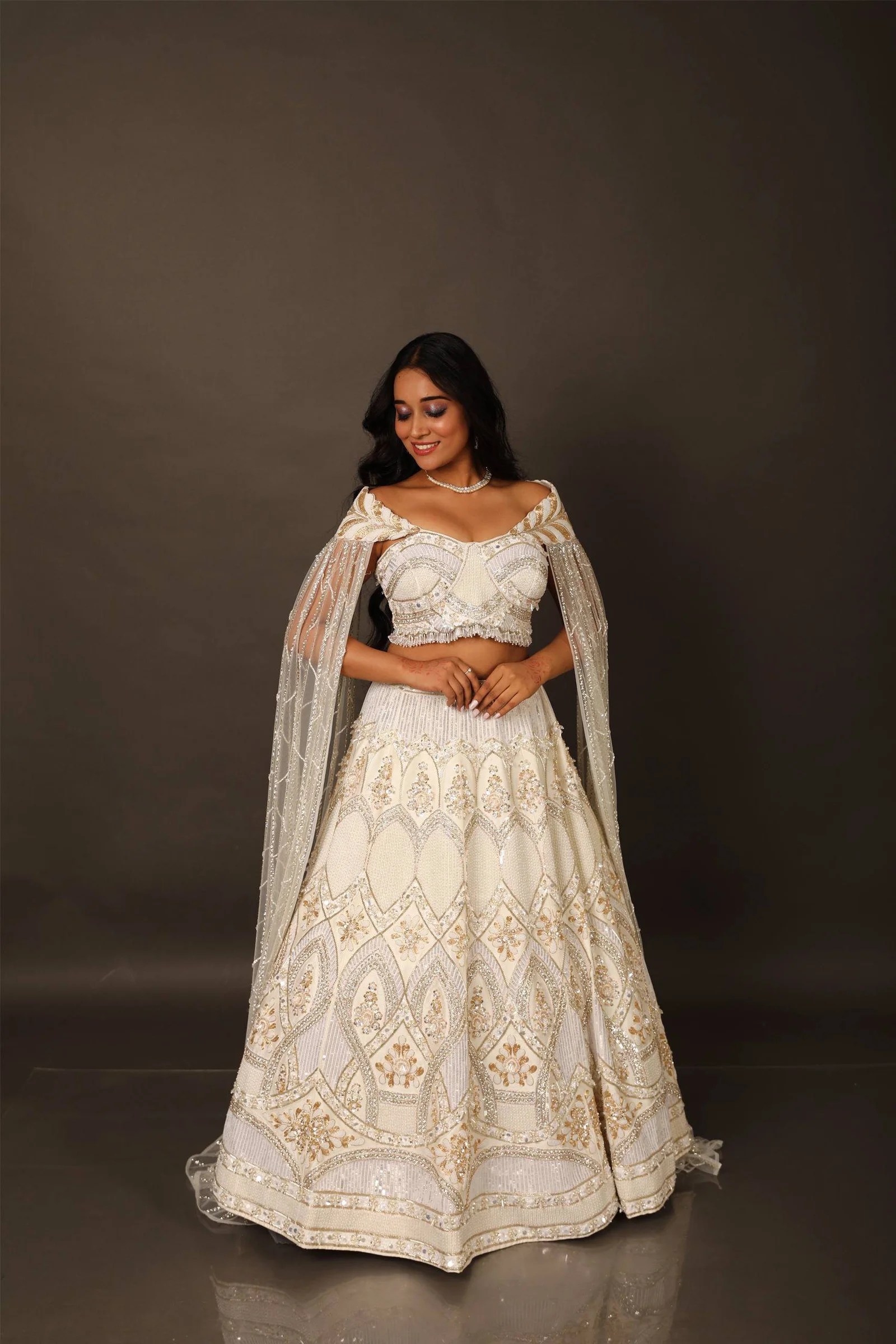 Step into timeless elegance with this exquisite White ghaghra choli, handcrafted to perfection. The ensemble features a gracefully flared lehenga paired with a off-shoulder stunning choli adorned with long tail sleeves, adding a touch of modern drama to a traditional silhouette.