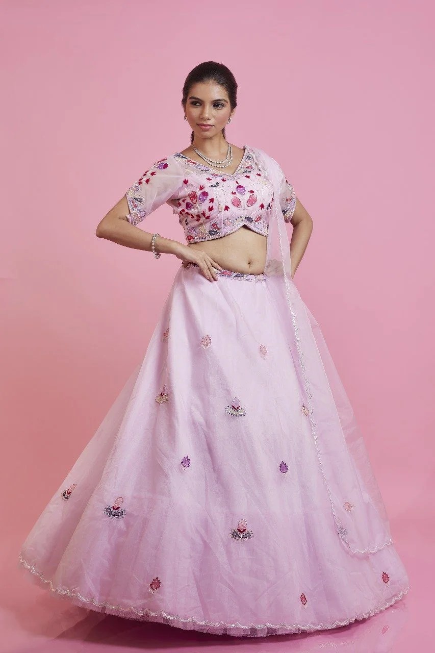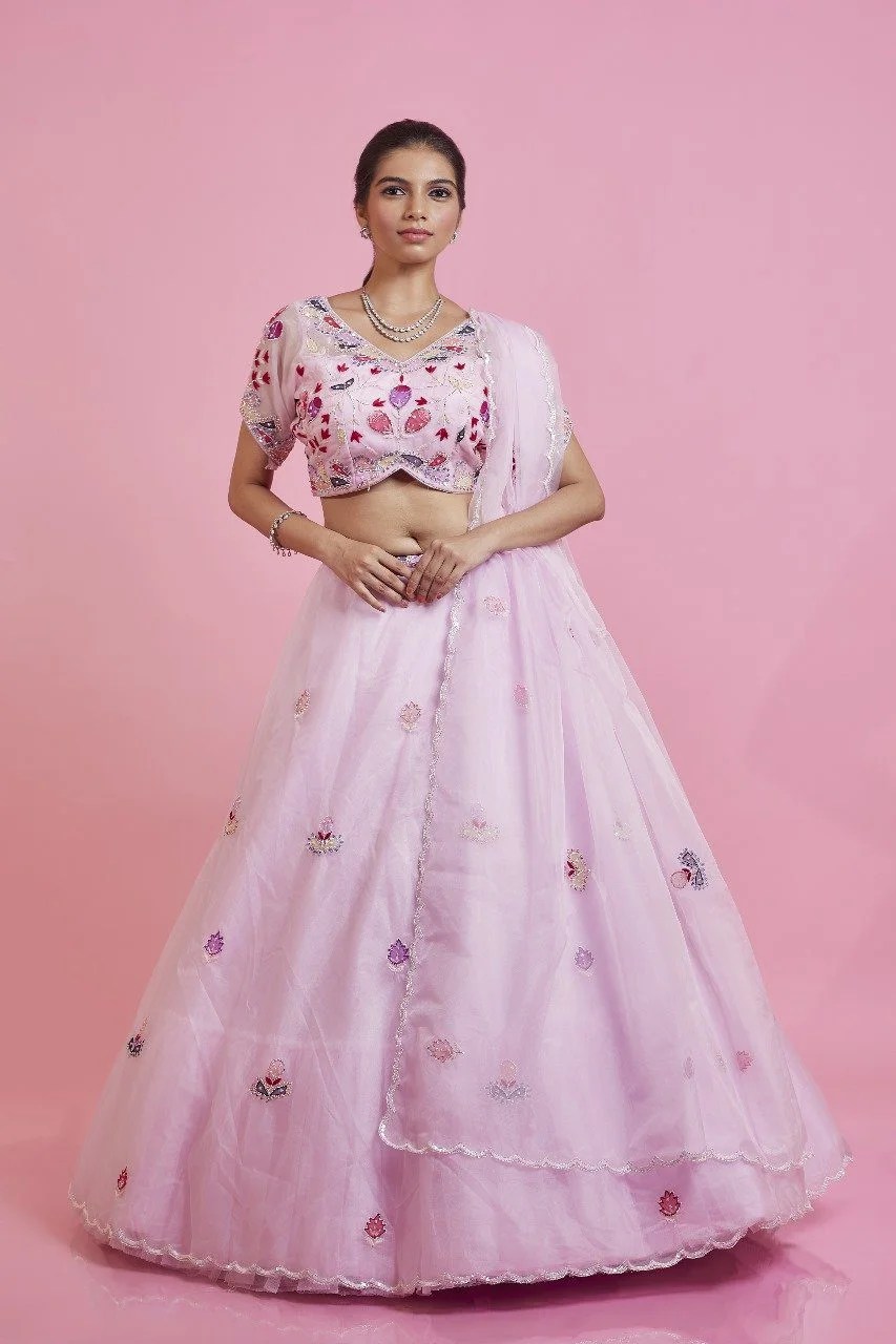 Grace meets artistry in this exquisite baby pink lehenga of sheer organza, adorned with vibrant applique floral motifs that bring a burst of color and character to the timeless base. Intricately highlighted with delicate pearl and sequence embellishments, this piece beautifully blends modern creativity with classic craftsmanship.