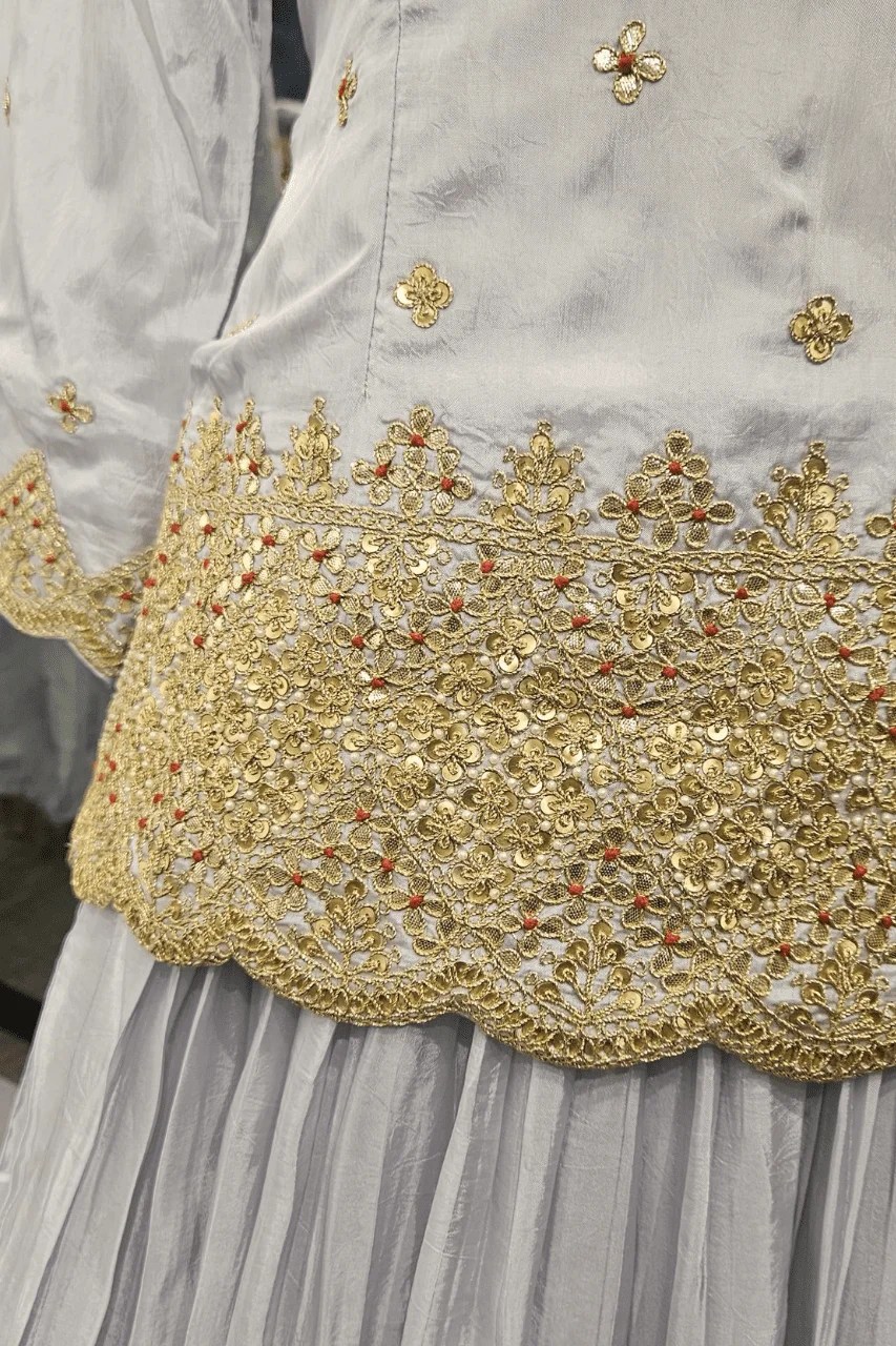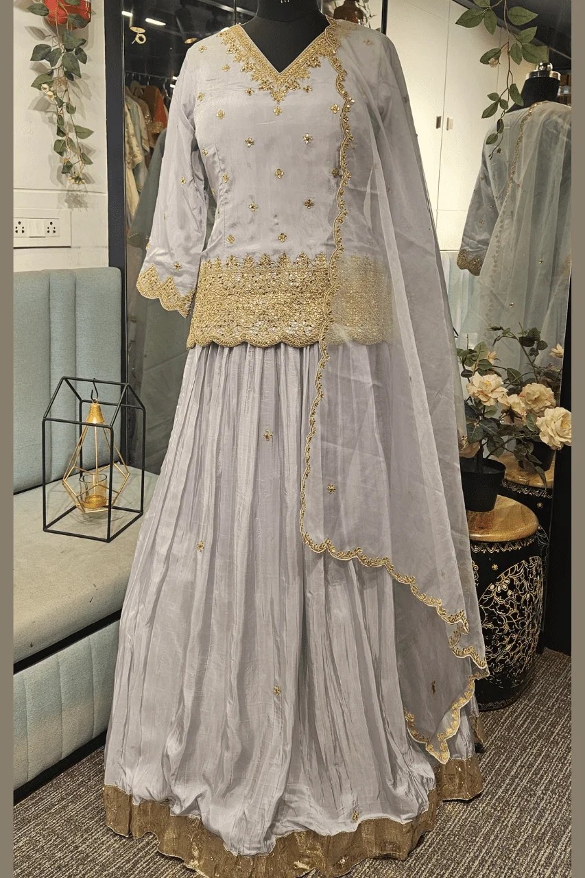Perfect for festive gatherings or wedding rituals, this elegant silk outfit features a short kurti, flared lehenga, and organza dupatta — all beautifully handcrafted with gotta, marodi and frenchknot work, adding a timeless royal charm to your celebration style.