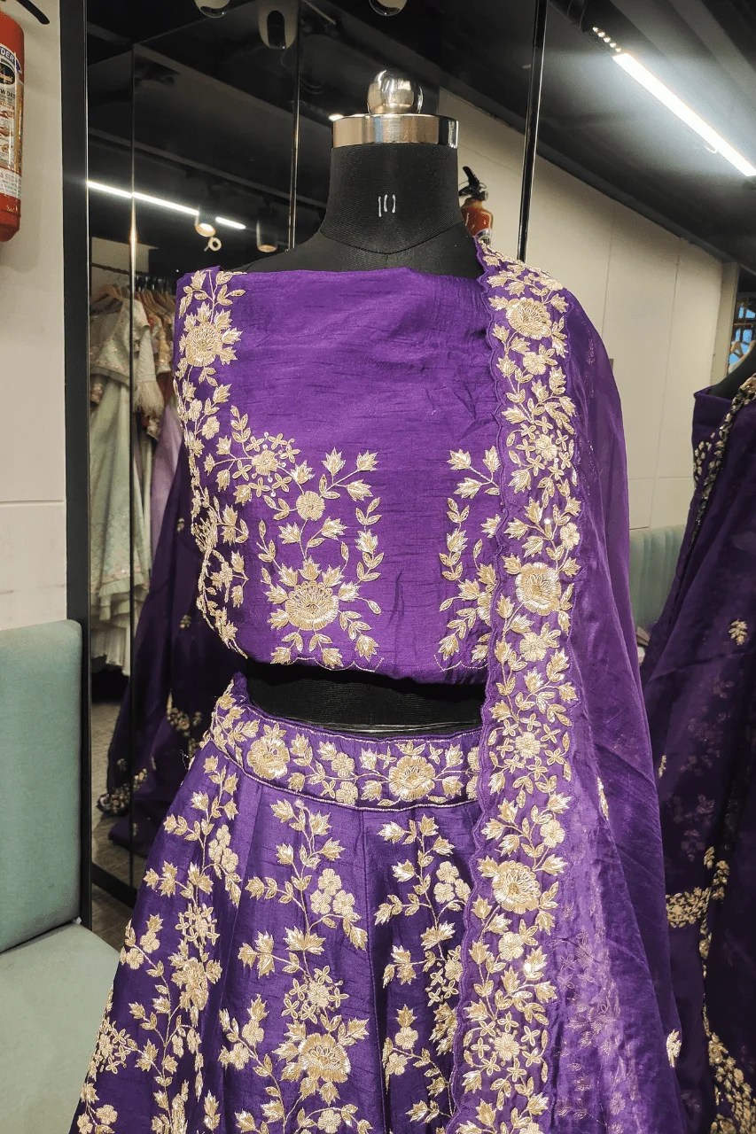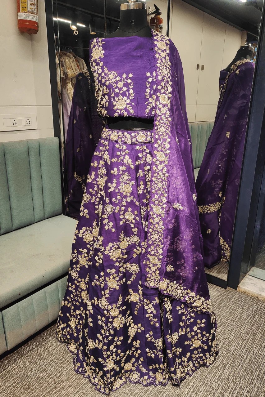 This exquisite vintage purple silk ghaghra is a true masterpiece, meticulously handcrafted with intricate full loaded zardoshi embroidery. The rich hue of the silk radiates royalty, while the detailed craftsmanship reflects traditional artistry. A modern silhouette and refined finishing touches add contemporary elegance, making it a perfect ensemble for weddings, festive occasions, or grand celebrations.