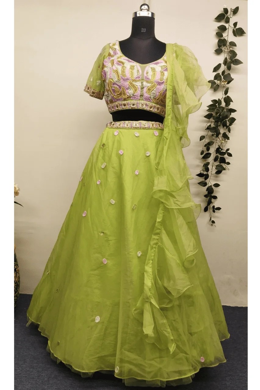Turn heads and steal hearts with this refreshing green lehenga, crafted from airy organza that flows with grace and lightness. Handcrafted with intricate multicolored sequin, pearl, and delicate thread work, every detail reflects vibrant artistry—perfect for carnival functions and festive celebrations.