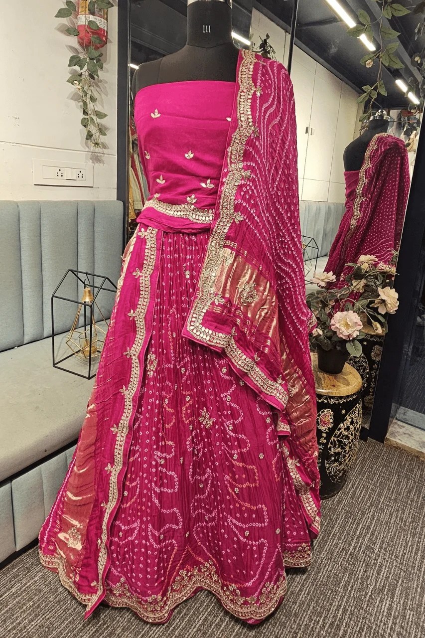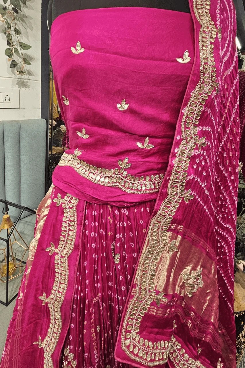 Perfect for weddings and festive celebrations, this elegant Bandhej lehenga in rich Gajji silk is adorned with traditional gotta and pearl handwork. Paired with an unstiched blouse and a beautifully scalloped dupatta border, it exudes timeless Rajasthani charm with a touch of modern grace.