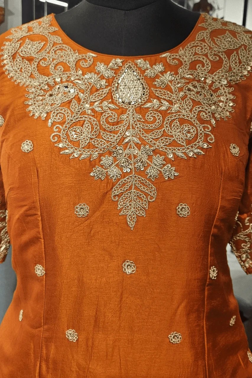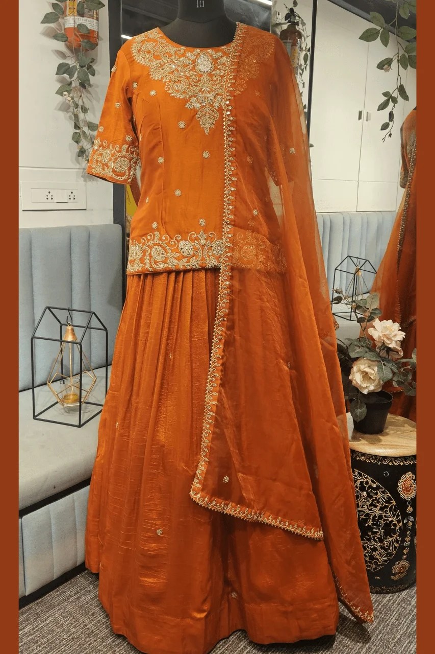 Perfect for festive gatherings or wedding rituals, this elegant silk outfit features a short kurti, flared lehenga, and dupatta — all beautifully handcrafted with marodi, sequins, and zardoshi work, adding a timeless royal charm to your celebration style.