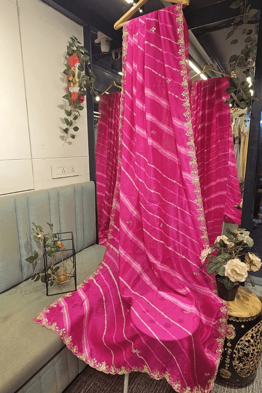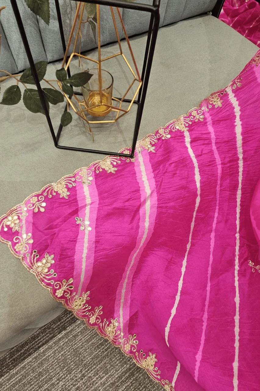 Elevate your festive look with this stunning lehriya saree in pure silk, adorned with intricate gotta and mirror handwork. The delicate detailing and vibrant hue blend tradition with timeless elegance. Perfect for weddings, sangeet, or special celebrations.