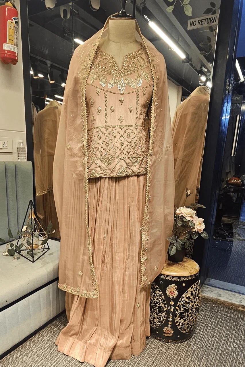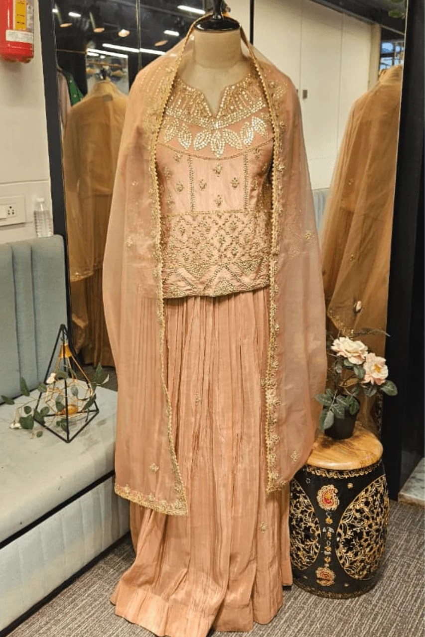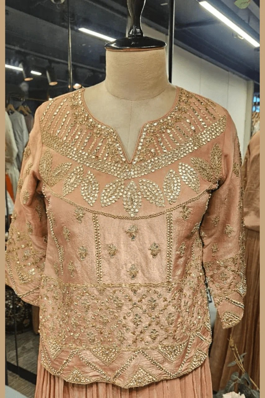 This stunning peach kurti lehenga set is a perfect blend of elegance and traditional artistry. The kurti is richly handcrafted with intricate gotta, sequence and pearl embroidery, creating a delicate shimmer with every detail. It is paired with a pleated ghaghra, adding graceful volume and movement to the ensemble. Completing the look is a sheer organza dupatta, highlighted with ornate embroidery and a scalloped border, giving it a refined finish.