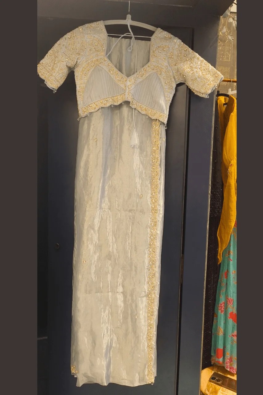 Elevate your elegance with this shimmering grey tissue saree, adorned with intricate cutdana and zardoshi embellishments. Lightweight and graceful, it’s the perfect choice for parties and wedding occasions, adding a touch of sparkle and sophistication to your look.