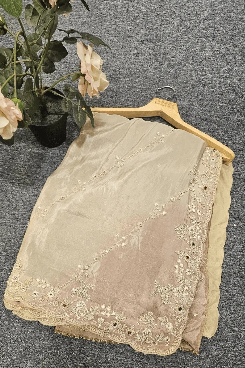 Elegantly handcrafted on silk organza, this ombre saree features exquisite sequence, cutdana,zardoshi, and delicate pearl work — a graceful blend of shimmer and sophistication.