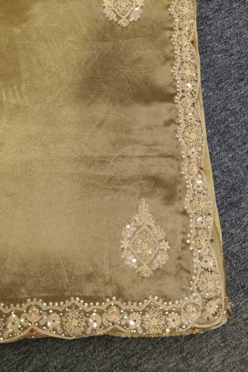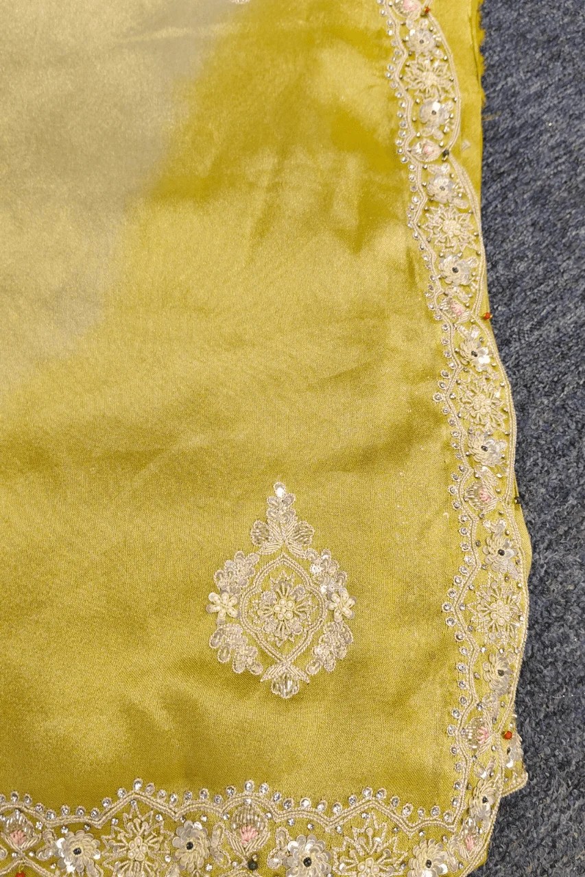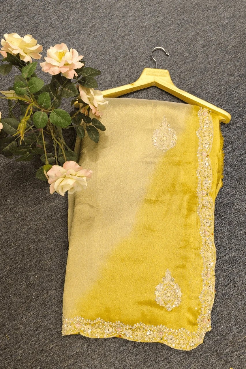 Elegantly handcrafted on tissue organza, this ombre saree features exquisite sequence, stone and delicate pearl work — a graceful blend of shimmer and sophistication.