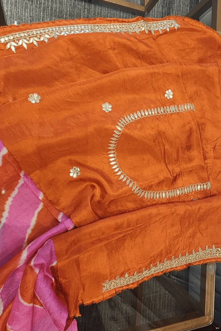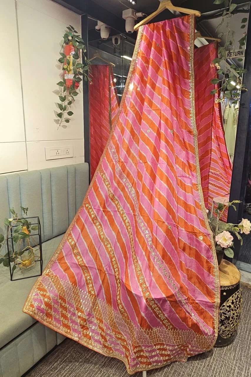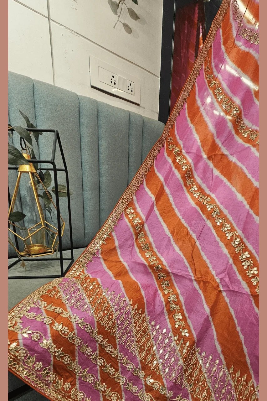 Elevate your festive look with this stunning two tone lehriya saree in pure silk, adorned with intricate gotta,pearl and marodi handwork. The delicate detailing and vibrant hue blend tradition with timeless elegance. Perfect for weddings, sangeet, or special celebrations.