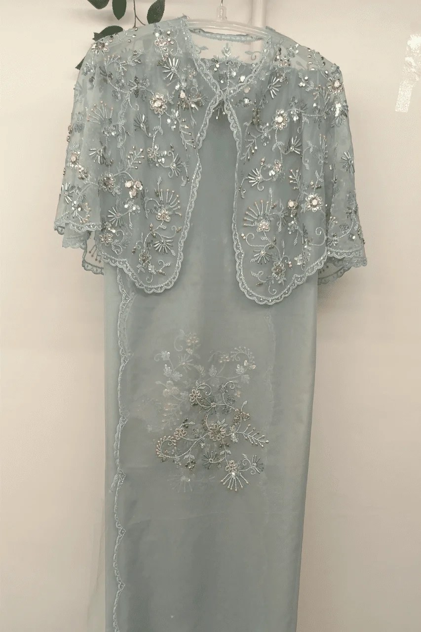 This Sky blue ensemble features a delicately embroidered blouse with pearl and sequin detailing, finished with cutwork border.Paired with a lightweight embroidered cape, it’s the perfect blend of grace and glamour for your special events.