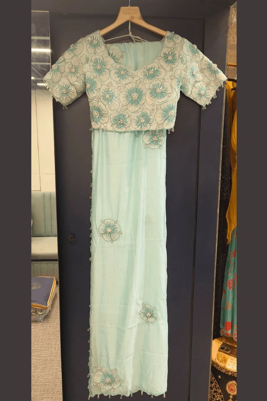 Elevate your elegance with this stunning Sea Green organza saree, adorned with intricate sequence and pearl embellishments on floral motifs. Lightweight and graceful, it’s the perfect choice for parties and wedding occasions, adding a touch of sparkle and sophistication to your look.