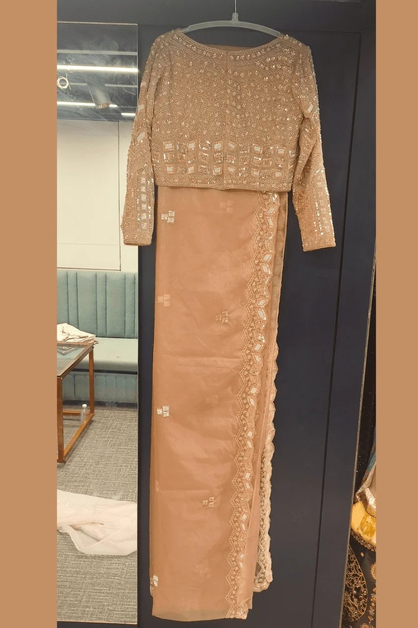 Elegant nude-tone organza saree adorned with intricate pearl, cutdana, sequence, and zardosi work. The richly embellished blouse and delicate border detailing add a timeless charm—perfect for graceful festive or wedding occasions.