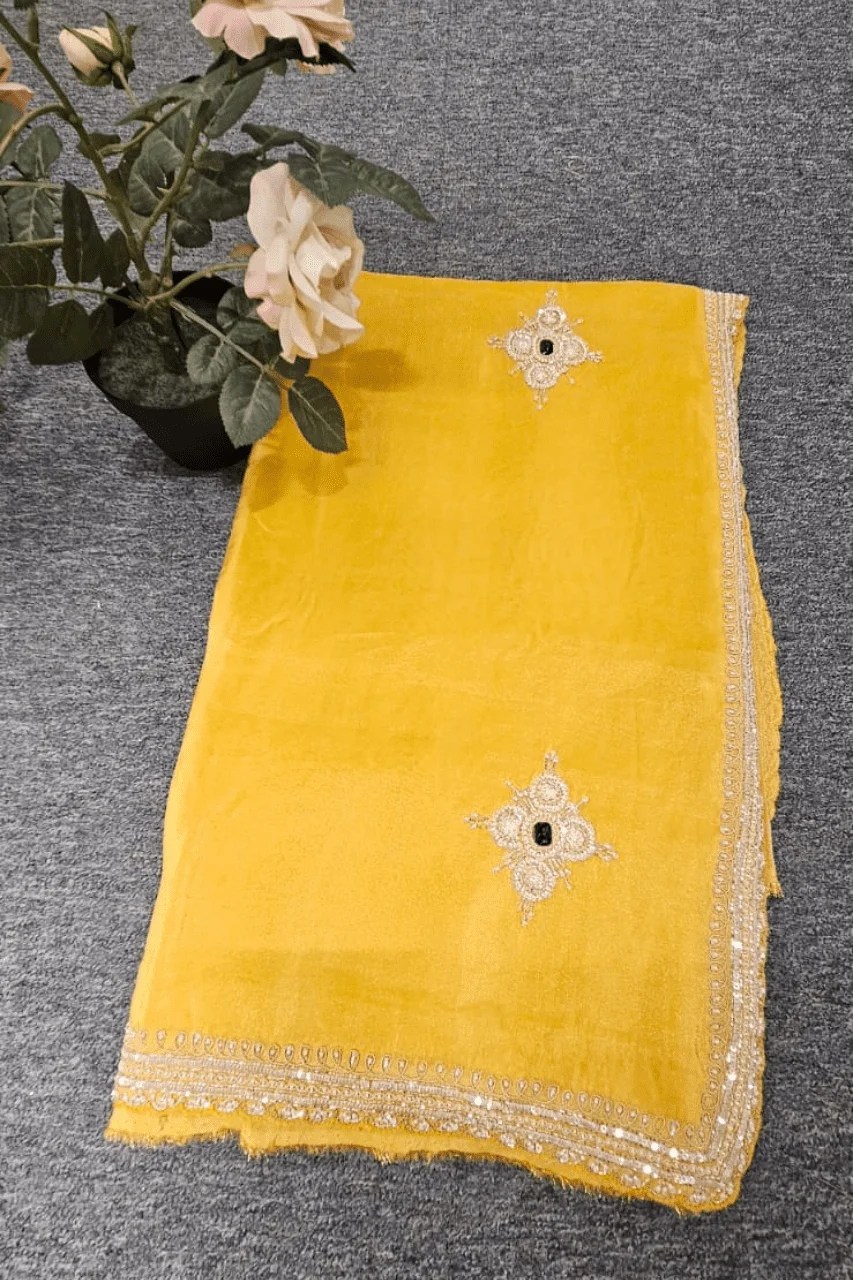 A stunning pearl tissue saree in a regal bright yellow hue, adorned with rich cutdana work, shimmering sequence, and delicate pearls. Traditional craftsmanship meets timeless elegance—perfect for festive and wedding occasions.