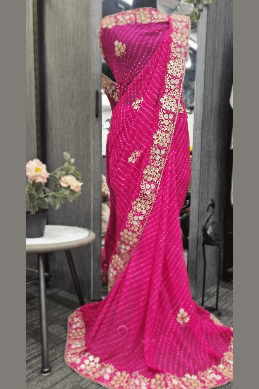 Elevate your festive look with this stunning mothda saree in pure georgette, adorned with intricate gotta and pearl handwork. The delicate detailing and vibrant hue blend tradition with timeless elegance. Perfect for weddings, sangeet, or special celebrations.