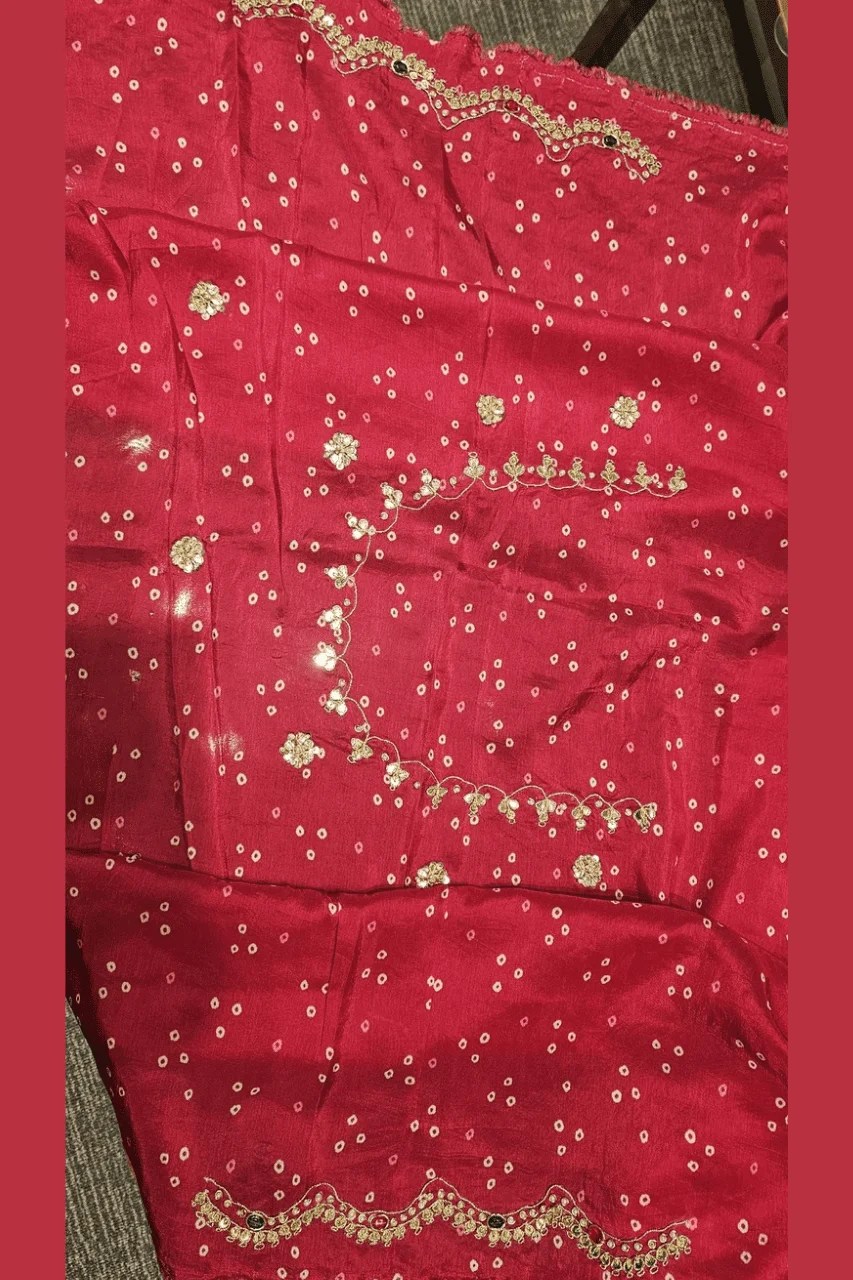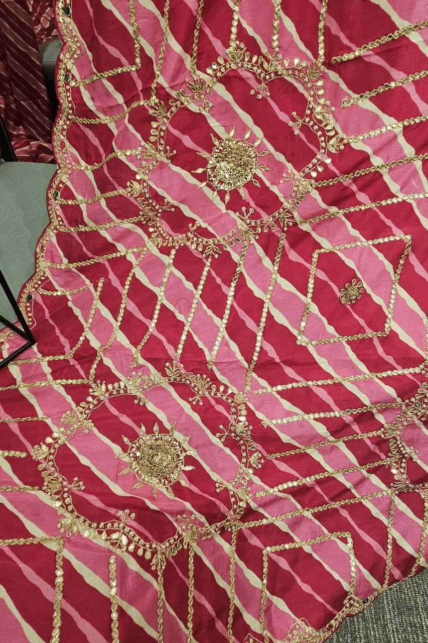 Elevate your festive look with this stunning two tone lehriya saree in pure silk, adorned with intricate gotta,pearl and sequence handwork. The delicate detailing and vibrant hue blend tradition with timeless elegance. Perfect for weddings, sangeet, or special celebrations.