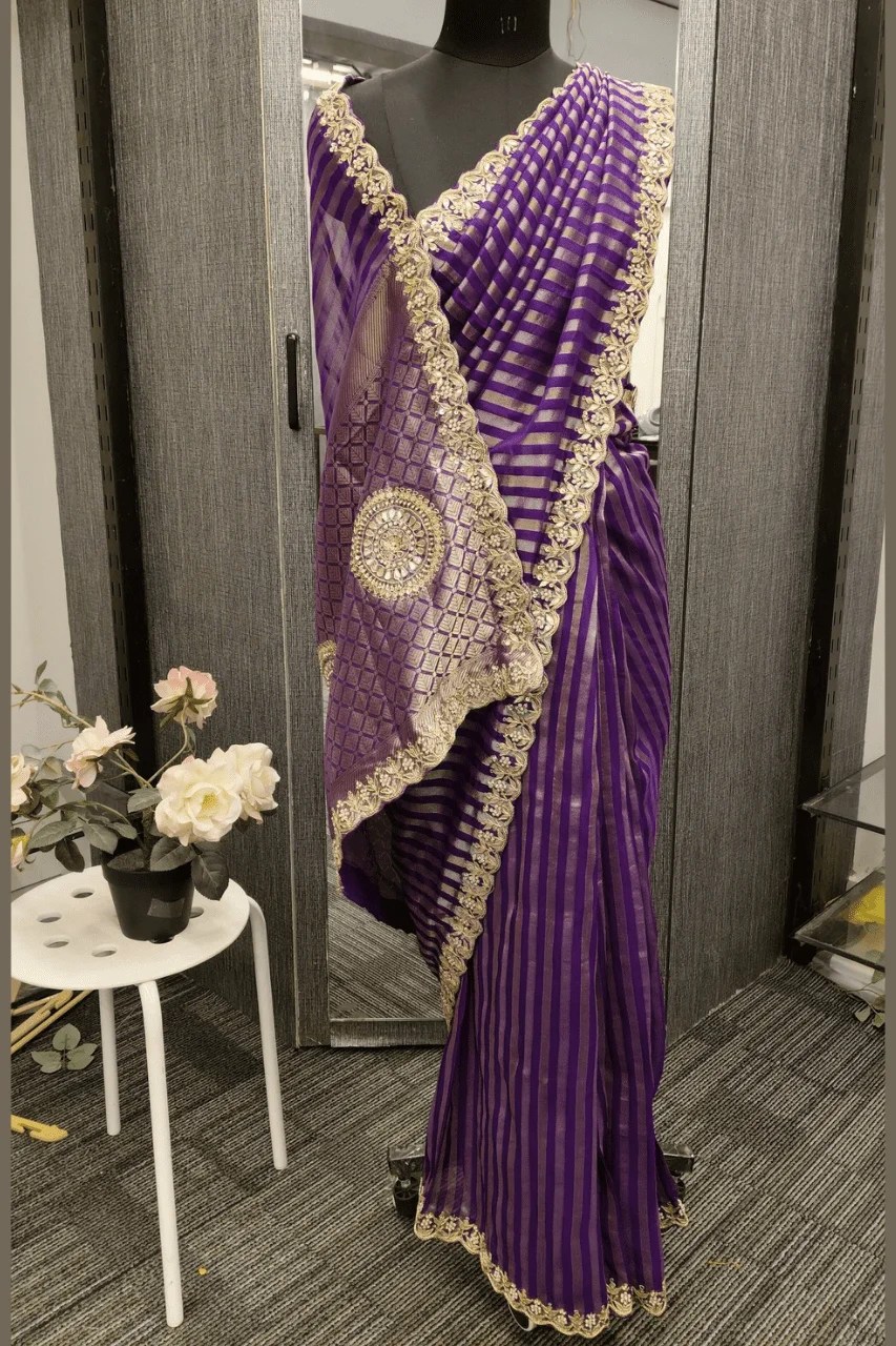 A majestic Banarasi saree in rich purple hues, gracefully embellished with intricate gotta, marodi, and pearl work. This regal drape exudes timeless elegance—perfect for weddings and grand festive occasions.