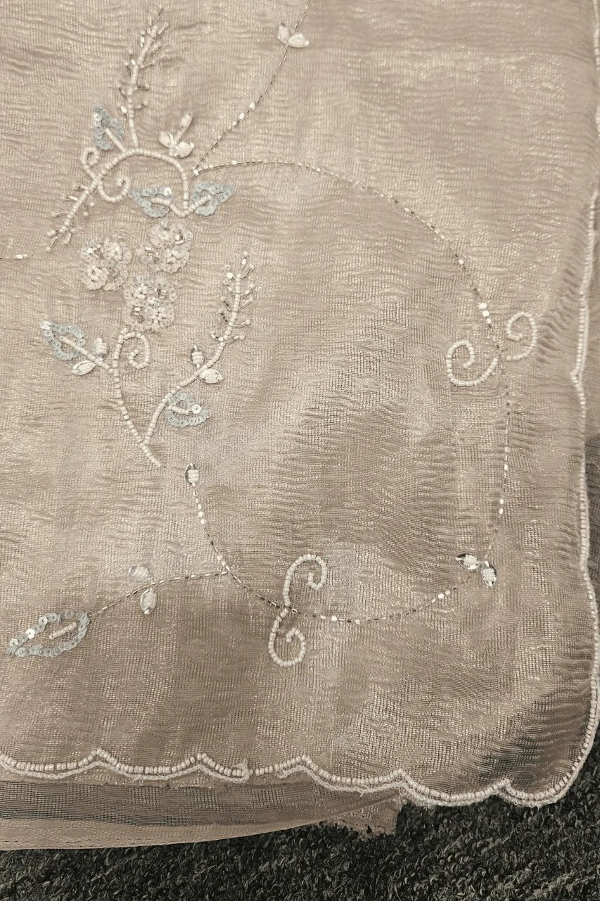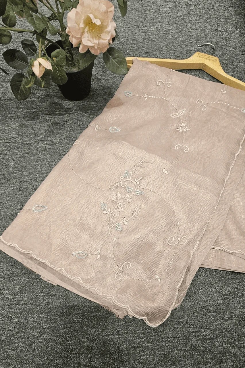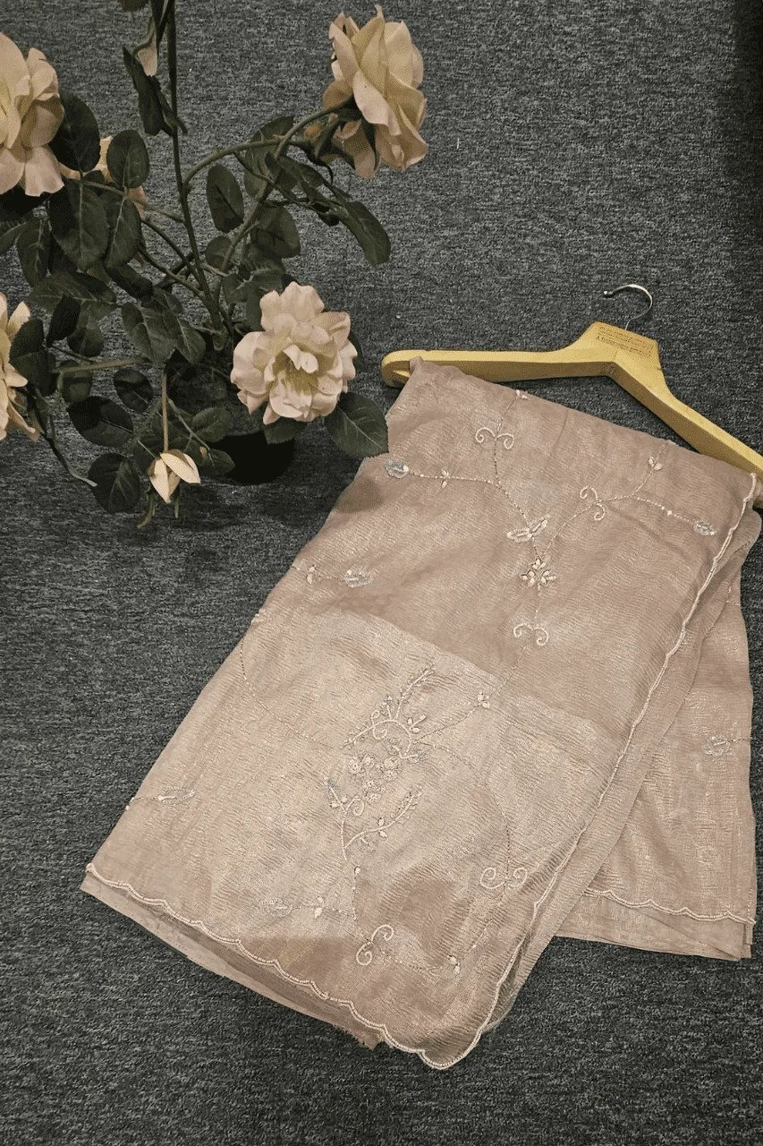 This elegant shimmer tissue saree is beautifully handcrafted with delicate sequence, pearl, and cutdana work along the booties, adding a subtle yet graceful charm. The understated floral motifs elevate its timeless appeal—perfect for sophisticated occasions.