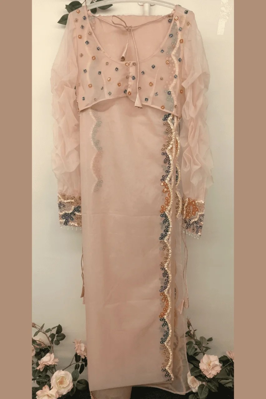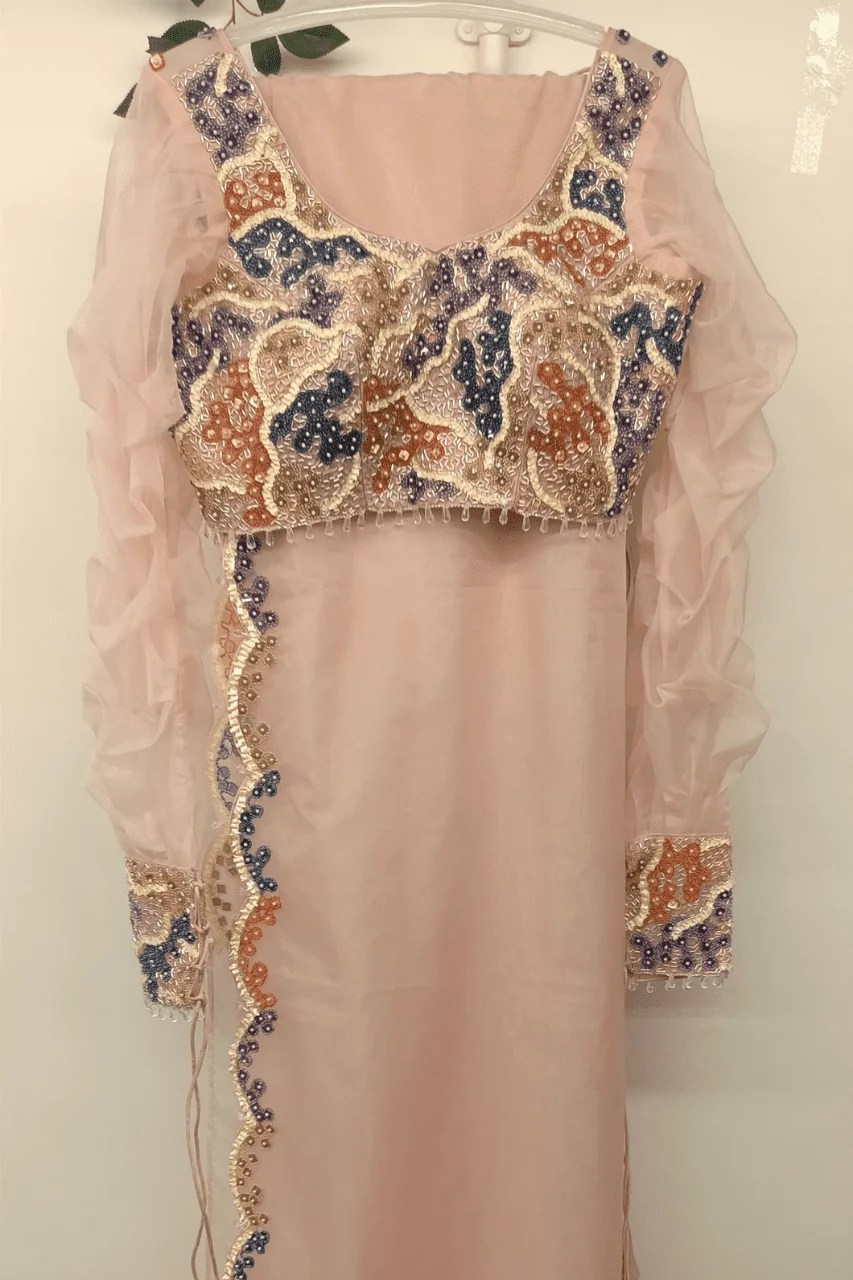 Turn heads in this dreamy baby pink organza saree, paired with a stylish fancy blouse featuring balloon sleeves and intricate multicolored pearl work. Perfect for weddings, parties, or any elegant celebration.