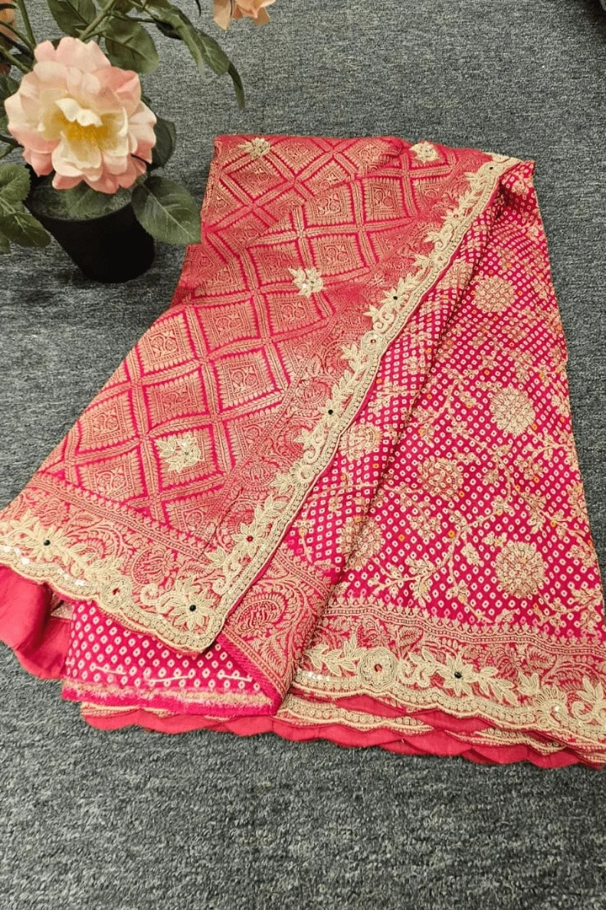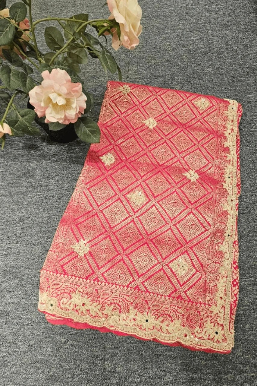 A stunning blend of tradition and luxury, this Banarasi Upada saree features intricate Zardoshi work, a richly detailed borders, and delicate Bandhej design within. A perfect statement piece for grand occasions.