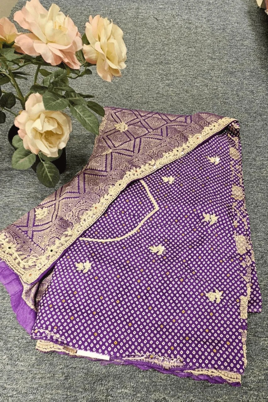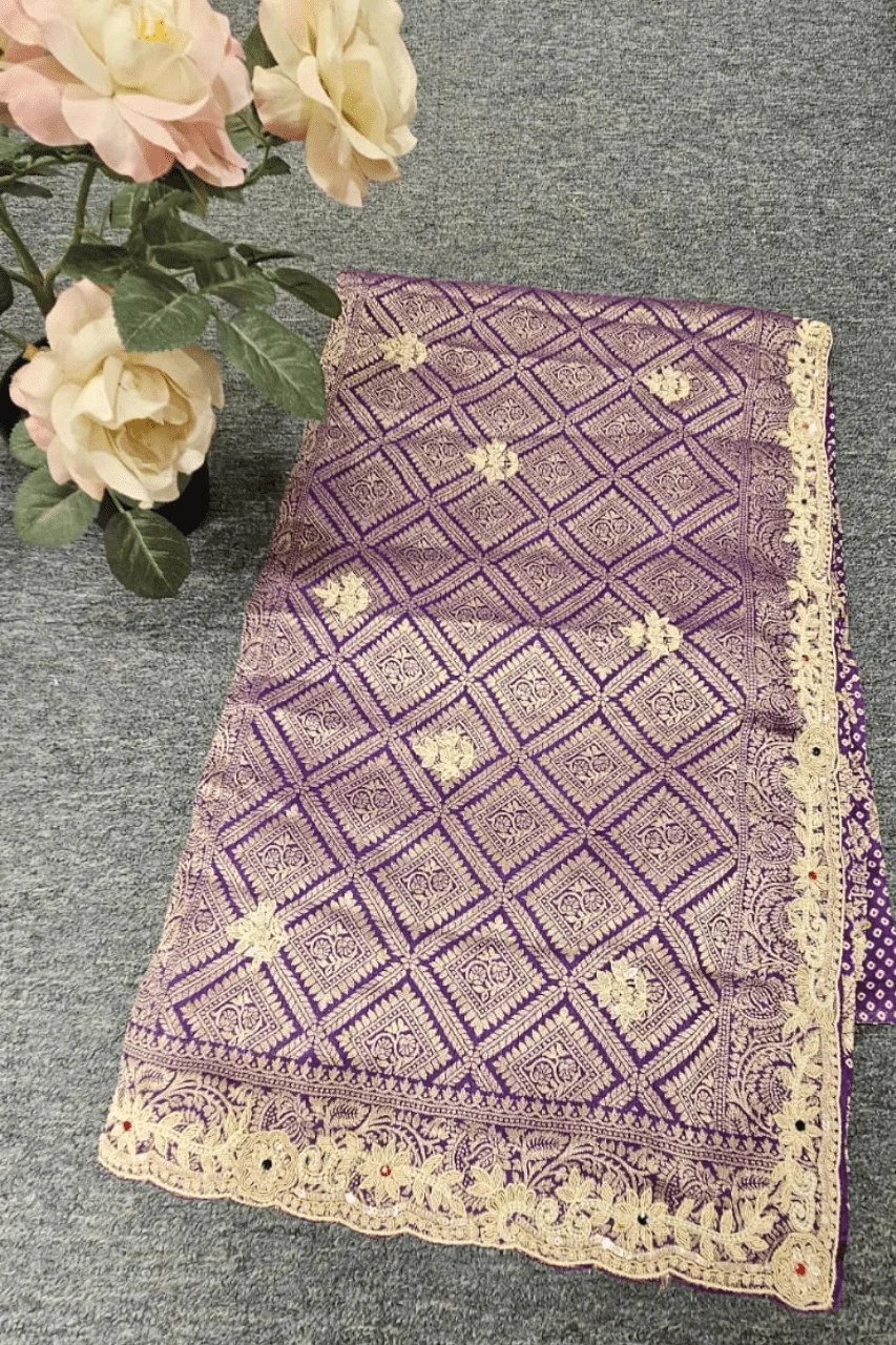 A stunning blend of tradition and luxury, this Banarasi Upada saree features intricate Zardoshi work, a richly detailed heavy border, and delicate Bandhej design within. A perfect statement piece for grand occasions.