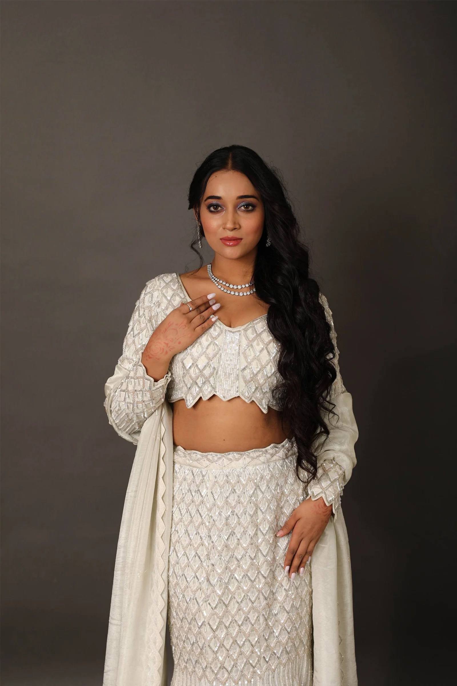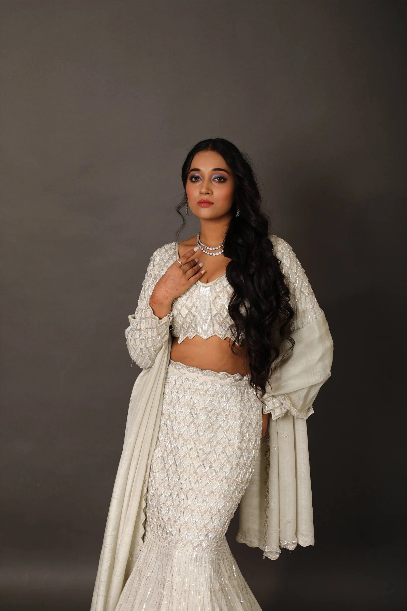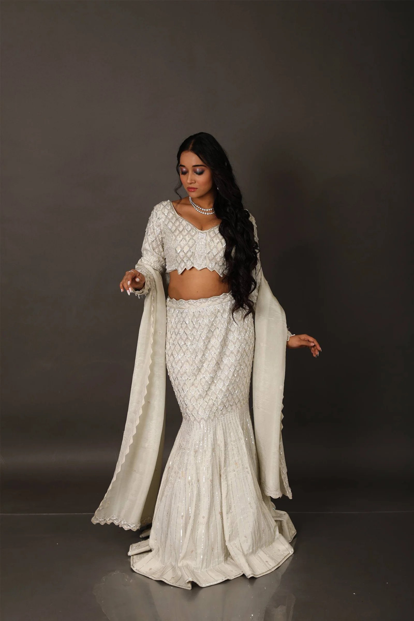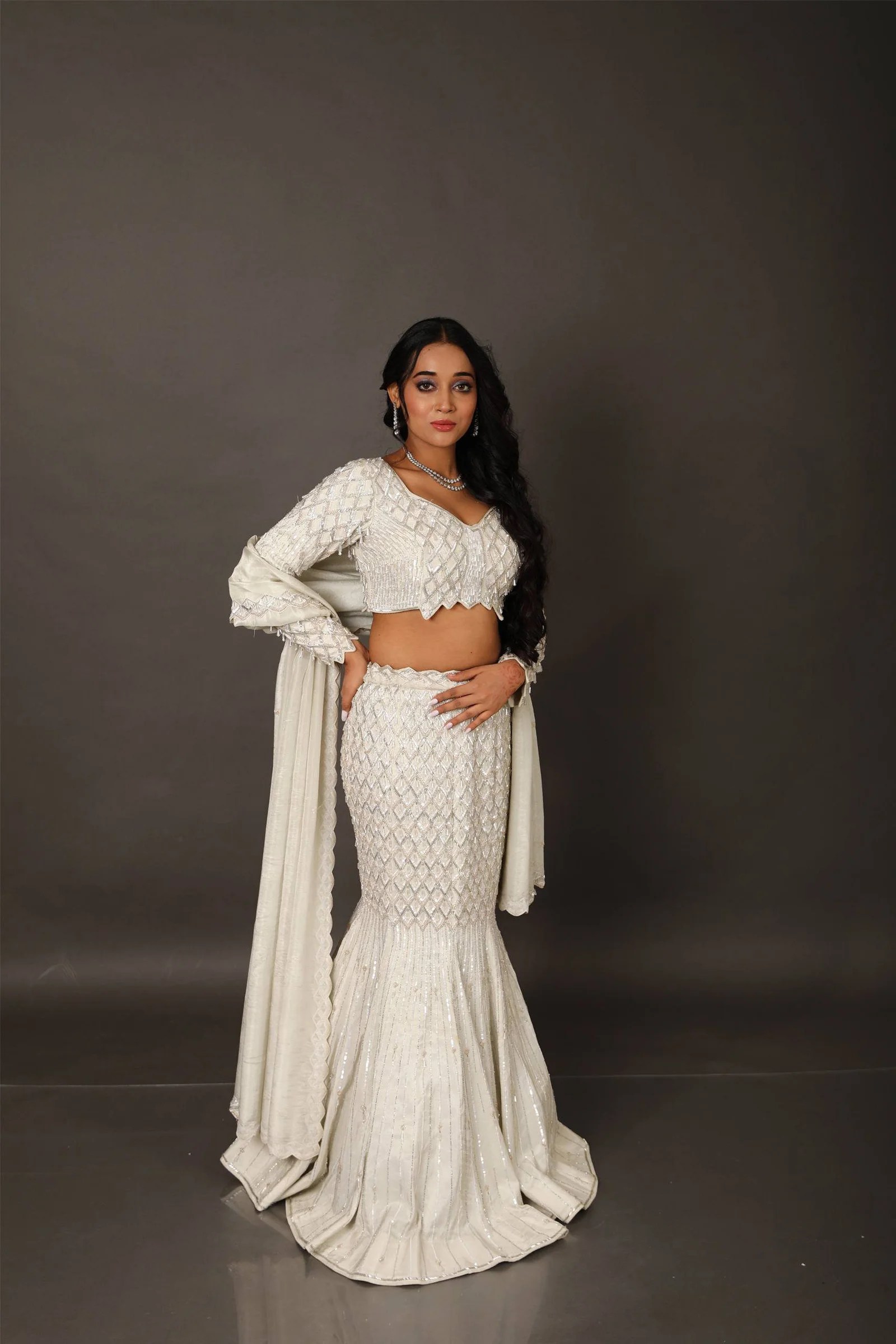 Make a bold statement in this exclusive fish-cut lehenga, tailored to perfection for modern elegance. Crafted on a rich pearl tissue base, the lehenga features intricate hand embroidery with heavy cutdana work, subtly blended with self-sequins for a graceful shimmer. The dramatic fishtail silhouette flatters the form and flares beautifully from the knee, creating a regal presence.