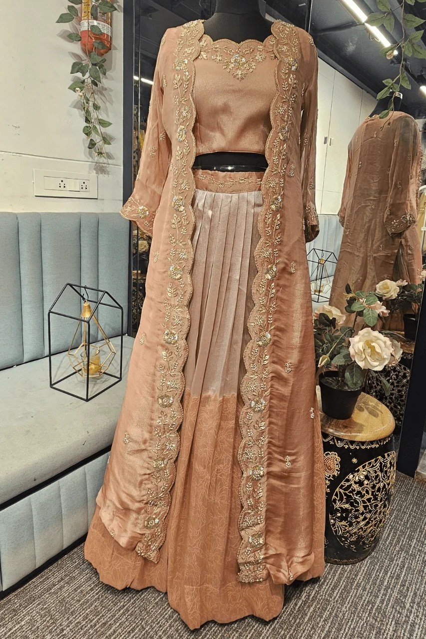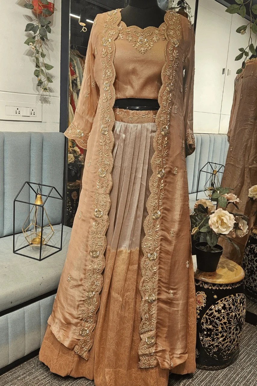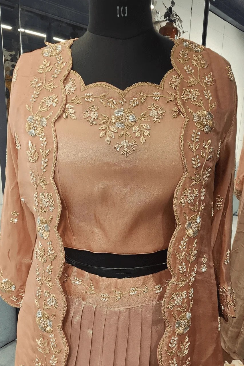 Step into timeless glamour with this rose pink colored lehenga set, crafted in Banarasi Tissue fabric. Paired with a beautifully detailed long jacket, the outfit is intricately handcrafted with zari, pearl, and zardoshi work. A statement ensemble that blends regal charm with festive finesse — ideal for weddings, receptions, or grand celebrations.